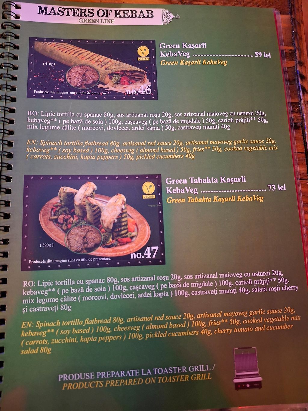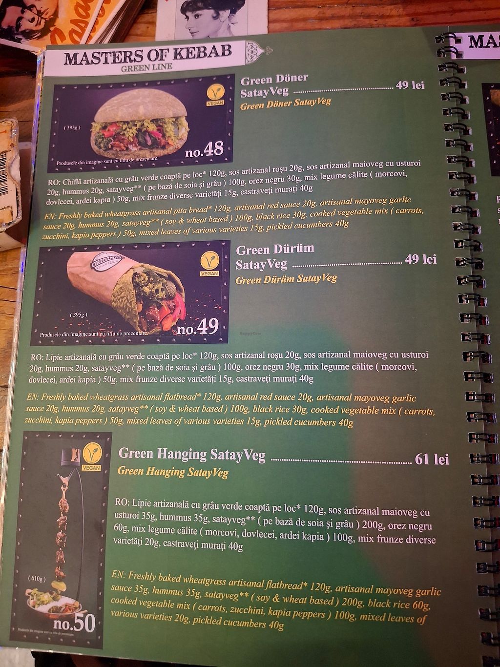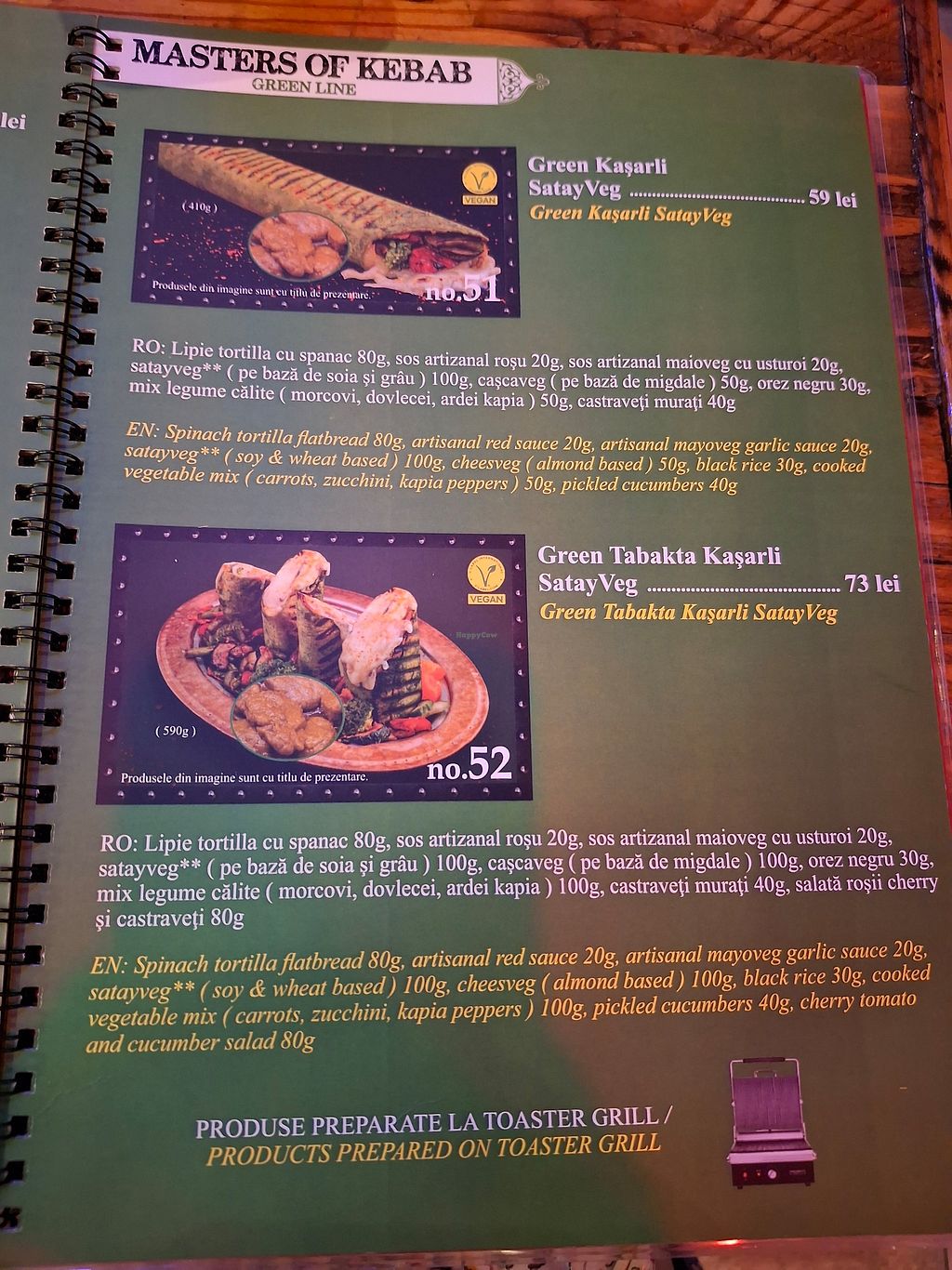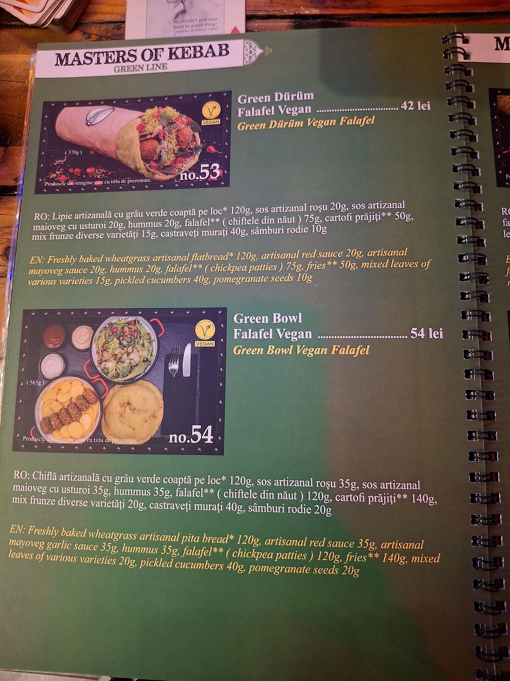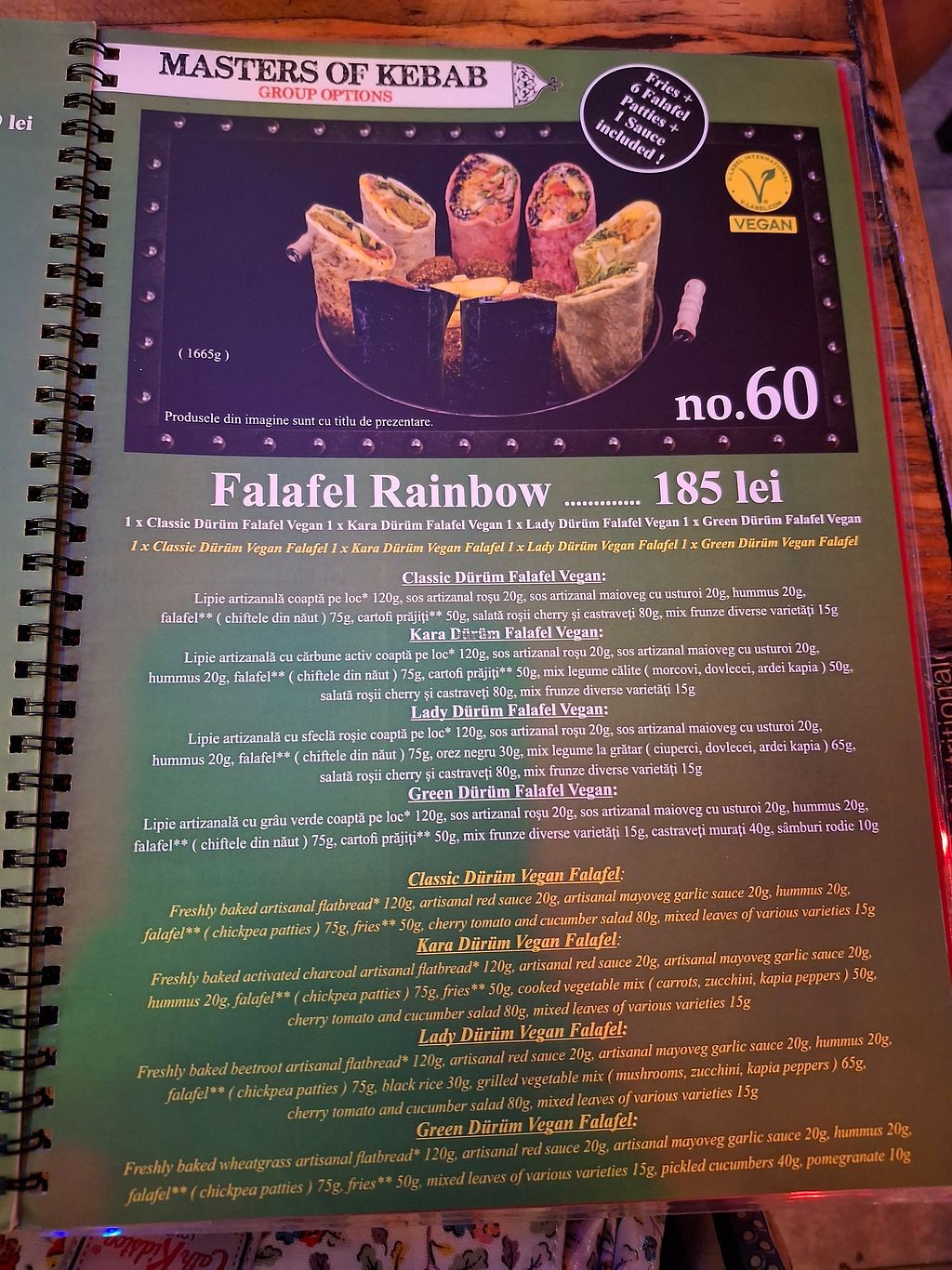 Delicious rolls, sandwiches and bowls with vegetables, sauces, falafel and soy based meat with different sides. An entire section (6 pages) of the menu is vegan, another part vegetarian.