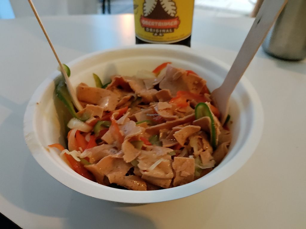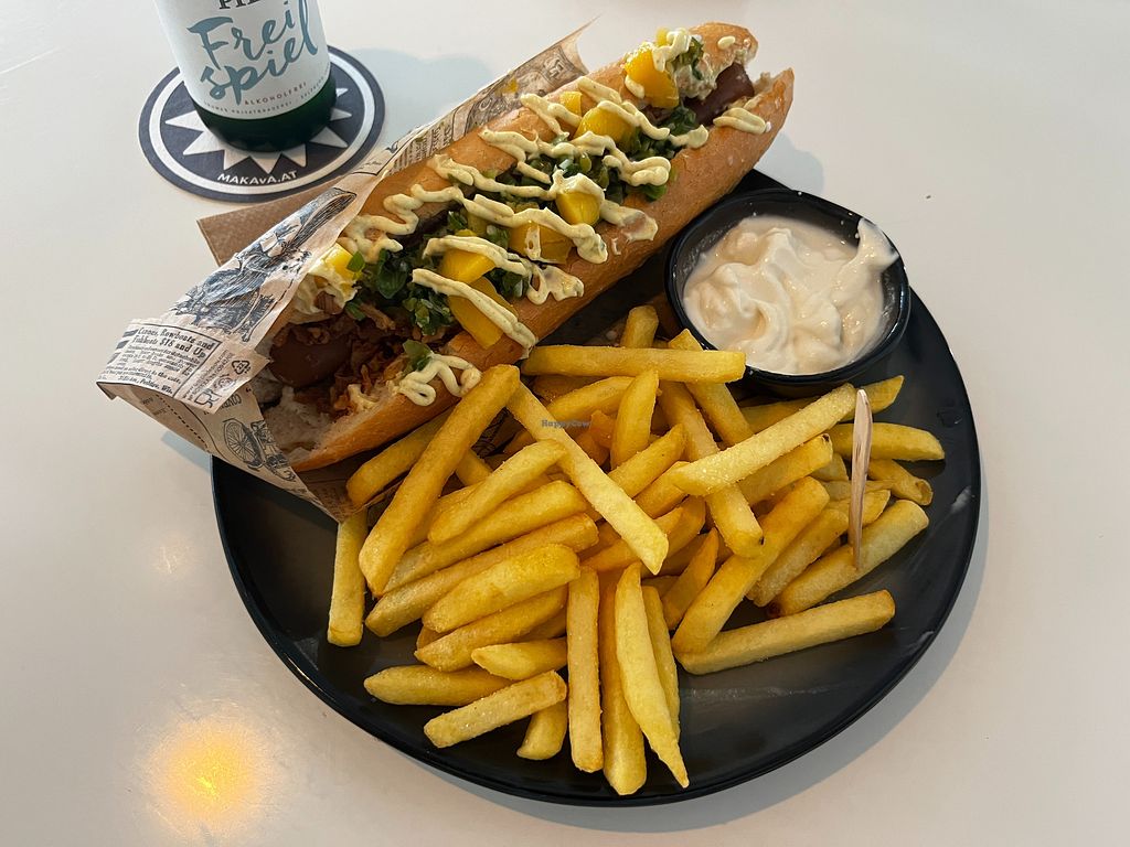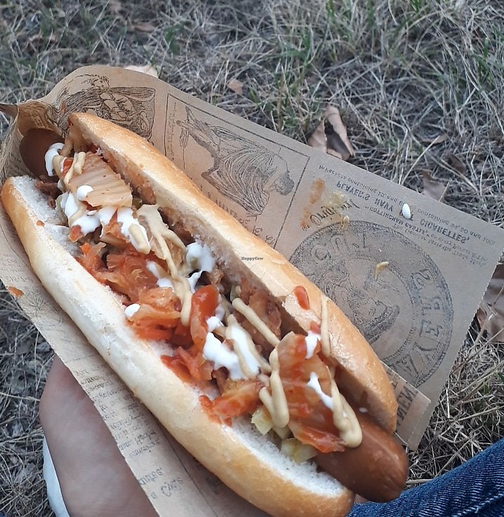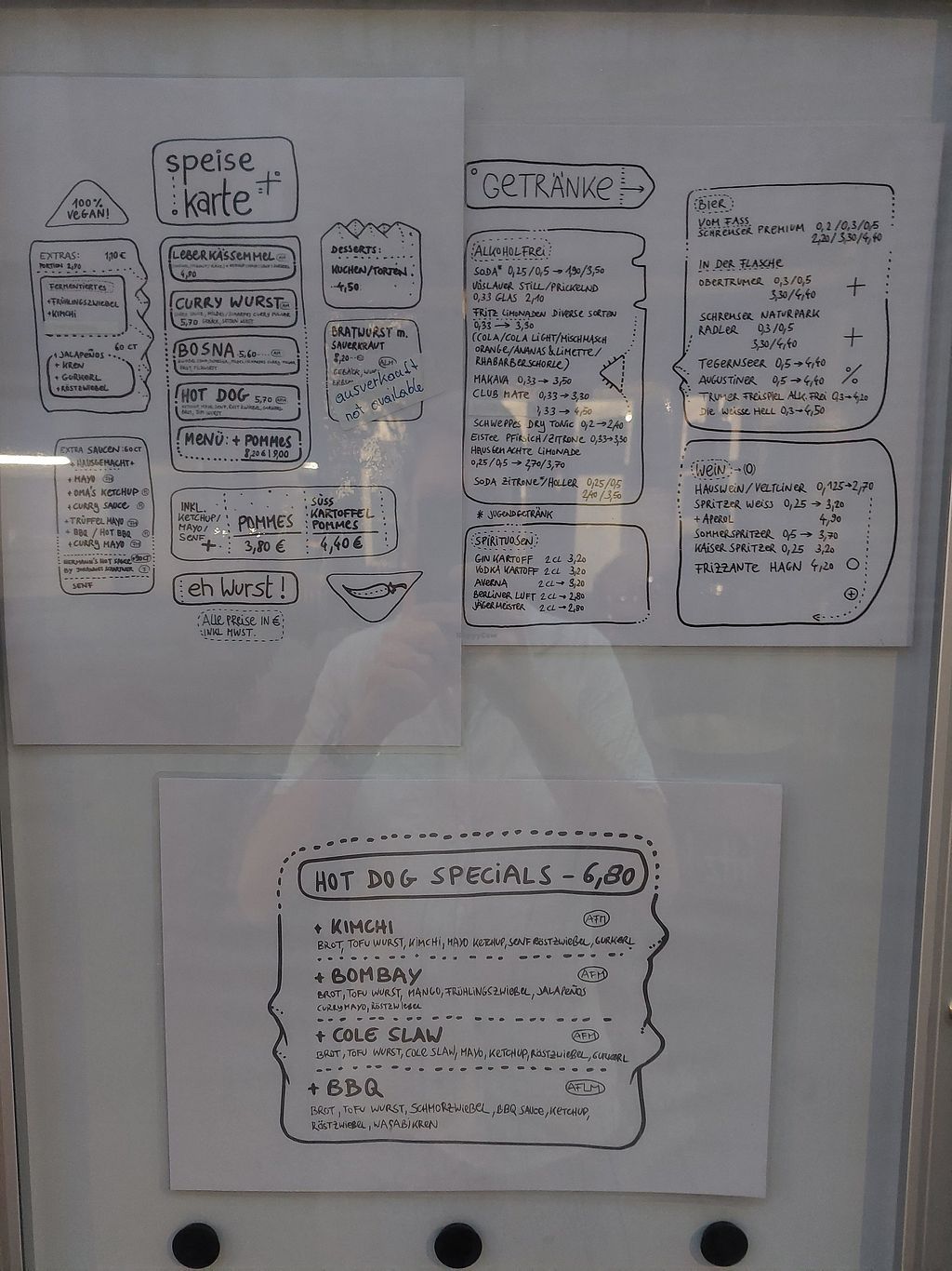 Oben "Hot Dog mit Kimchi" (Tofuwurst, Kimchi, Majo, Ketchup, Senf, Rös…