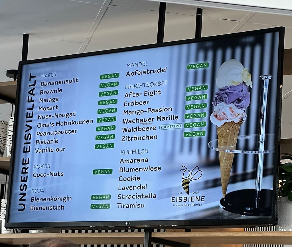 Hab noch nie so ein gutes veganes Eis gegessen. Besser als Veganista in Wien meiner Meinung nach. Gaaaanz viele vegane Sorten (Sorten wechseln oft aber zB klassisch wie Schokolade, Vanille oder Fruchtsorten, aber auch ganz viel andres Pistazie, Mohnkuchen, Brownie, Malaga, After Eight...), aufgelistet nach Milchalternativen.