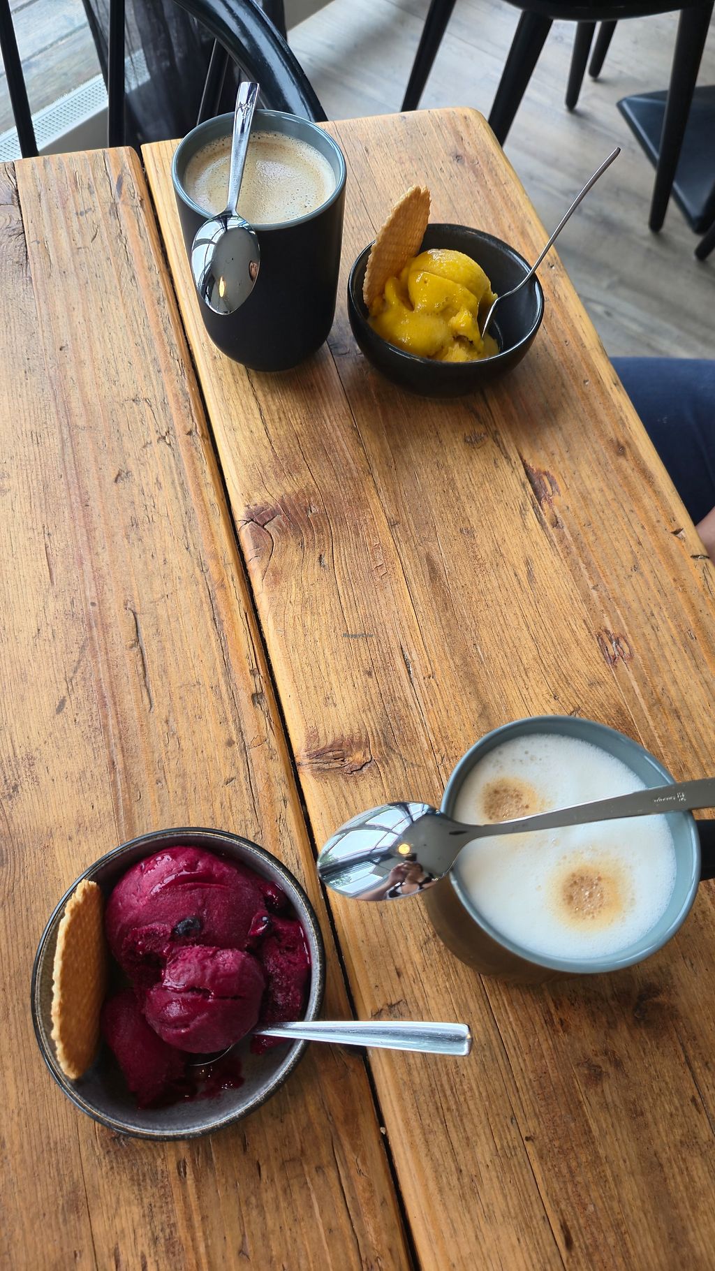 The location is definitely worth visiting. You can make a stop here after a bike ride or even by boat. There is also a parking for cars.You can have oatmilk in various coffees and chai latte. They offer sorbet ice cream with different toppings.