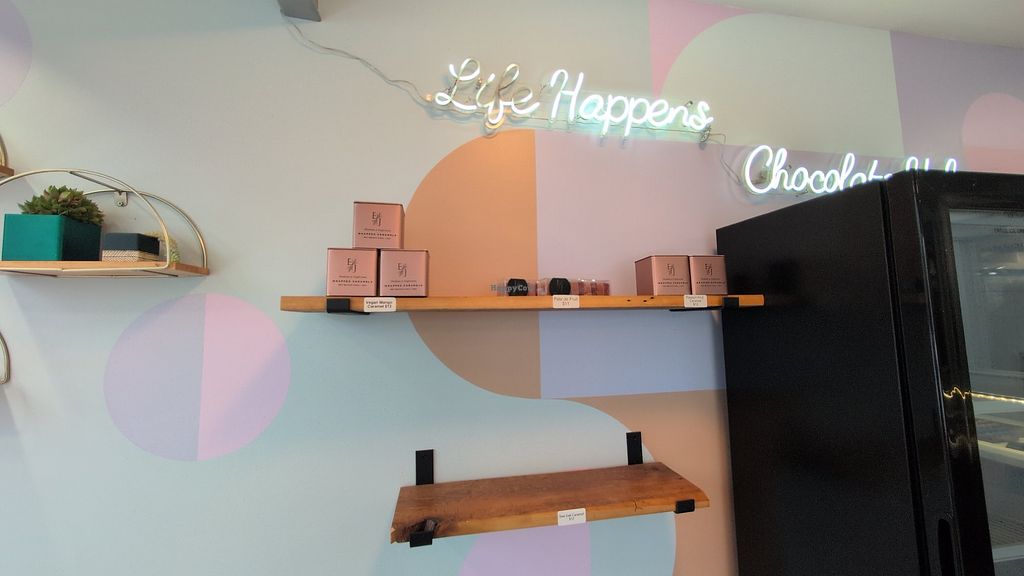 Tiny little chocolate shop with a few vegan options. All the flavors were creative, colorful, cute. Staff was so, so friendly! Only interesting thing was how much packaging they gave us. The chocolates came in a box that looked like a jewelry box, including plastic molds to hold the chocolates in place. Then that box was put in a high quality gift bag AND had a big brochure inside the bag with a colored print of all their current flavors. We felt bad throwing all that packaging away, honestly.