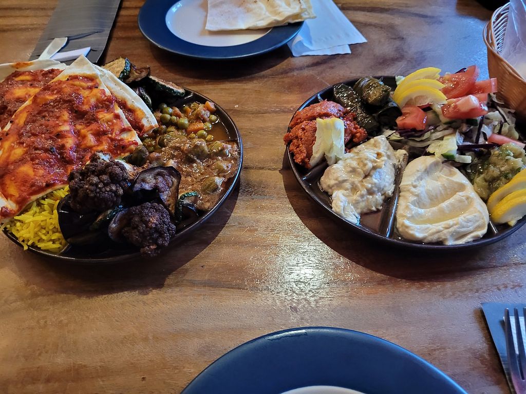 Vegan schotel - stuffed vine leaves, falafel, fried veg parcels, salad…