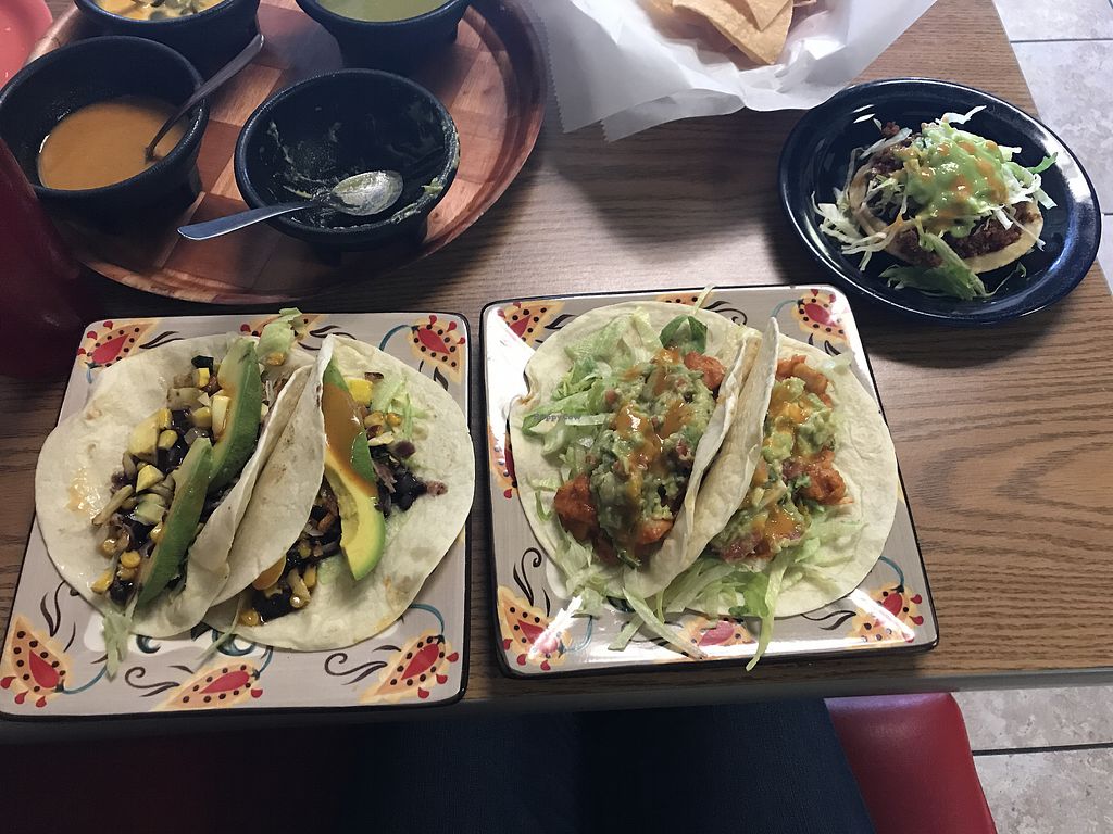 Black bean and corn tacos, jackfruit tacos, and sopes with spicy “chor…