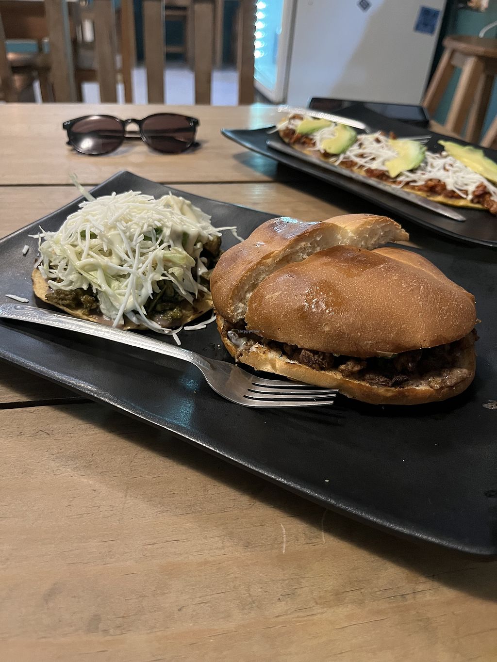 They have tacos, tortas, tostadas, and huaraches with a variety of “meat” options (chicharron, chorizo, saudero) made from soy, seeds, and other veggies.
