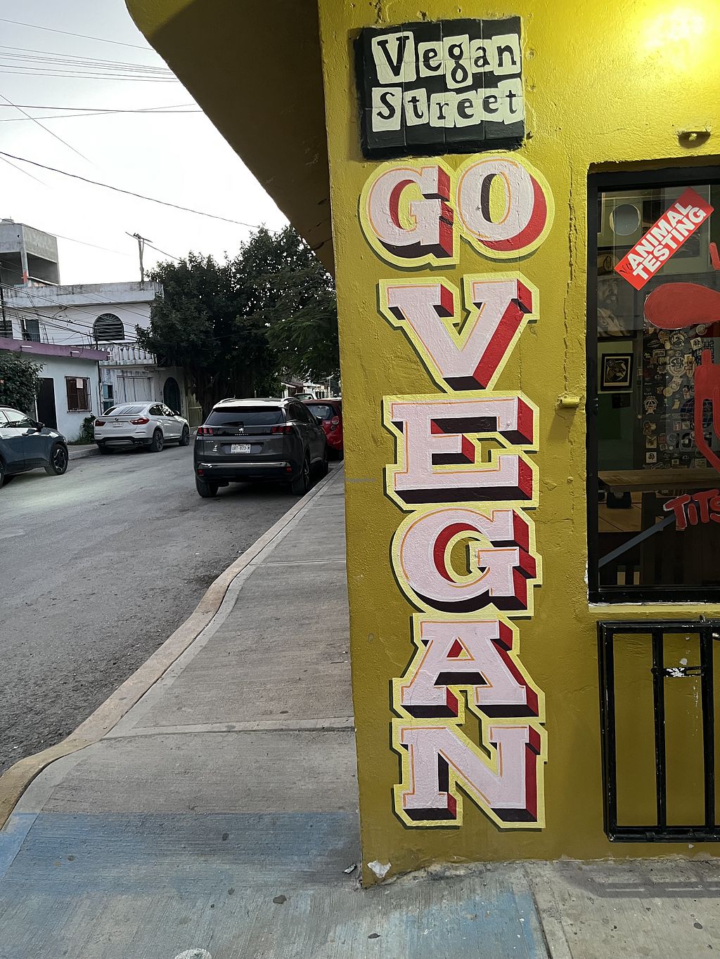 First I got very attracted by the look of the restaurant. All these vegan activists messages on the walls. But then the food! The tacos with the “green” and “red” thing were the best food I had in Mexico. We asked to be served again and again. It was cheap but also so tasty, like new savours to our guts.