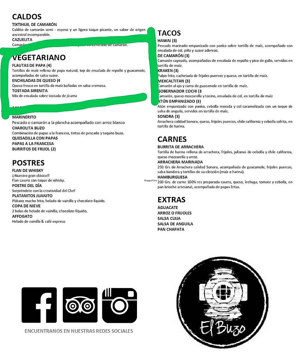 Serves meat, vegan options available. Seafood bar. One of the fewest in town that includes a clearly vegetarian menú with vegan options., Flautas de papa, Tostada Sirenita, Guacamole order, French fries order, Enchiladas de queso (vegetarian), Quesadilla de queso (vegetarian). Open Mon 12:00pm-8:00pm, Tue 12:30pm-8:00pm, Wed 12:00pm-8:00am, Thu-Fri 12:00pm-8:00pm, Sat-Sun 1:00pm-9:00pm.