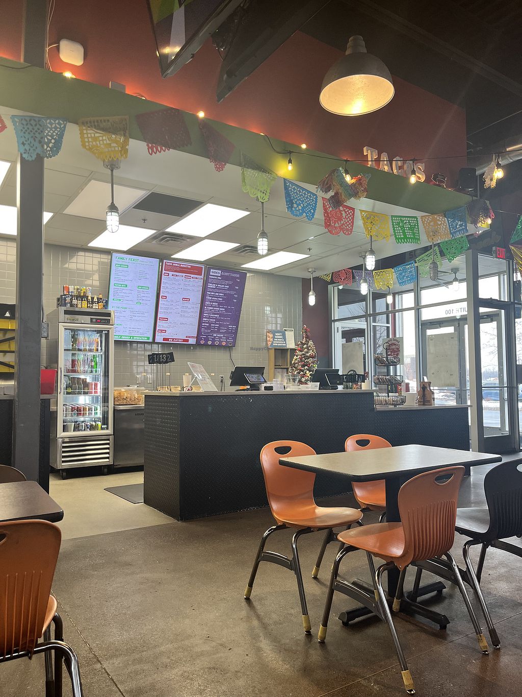 Rajas tacos (left), Vegetarian Crumble tacos (right), side of chips & …