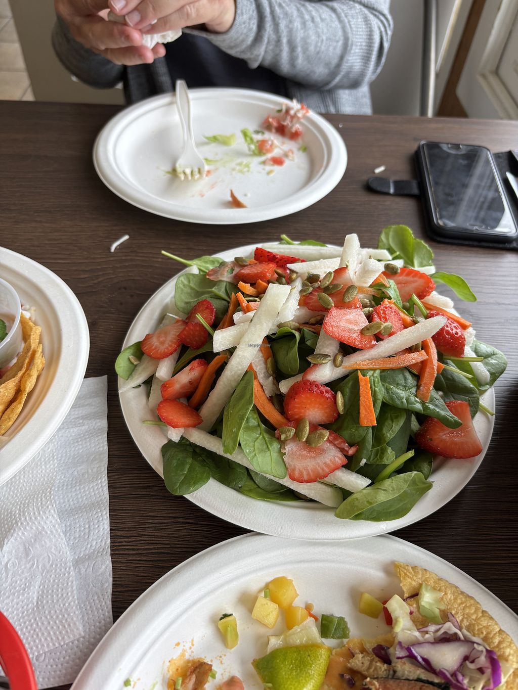 Spinach salad 5/5 simple yet so delicious! Strawberries, jicama?, and pumpkin seeds were a nice touch. Great contrast to the rest of the meal (light feeling). Special shoutout to the salad dressing (a sweet, applesauce like taste 😋)