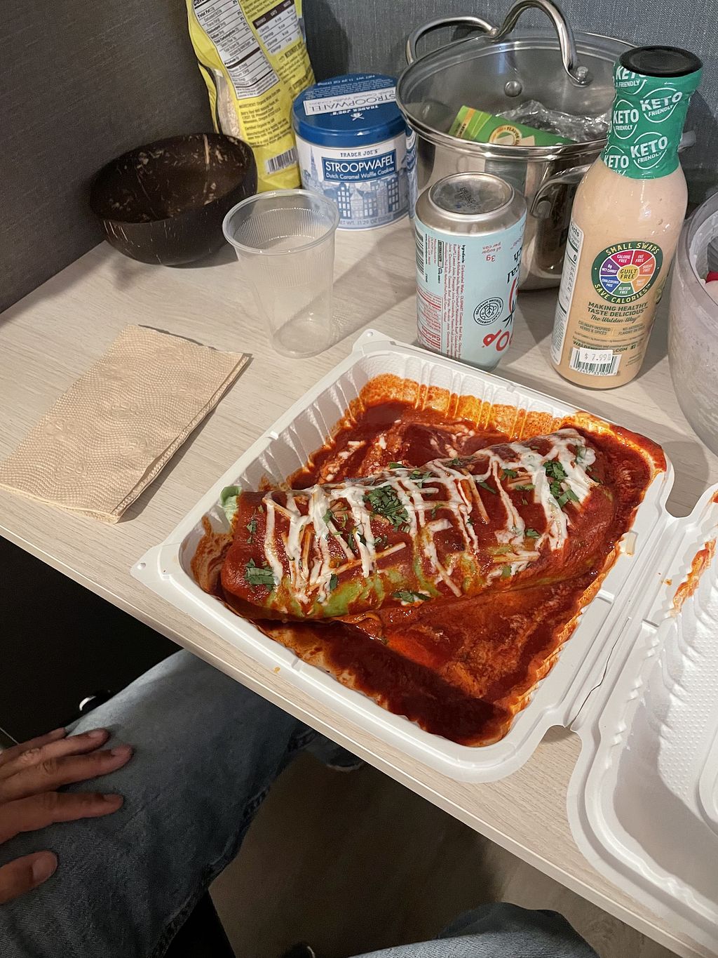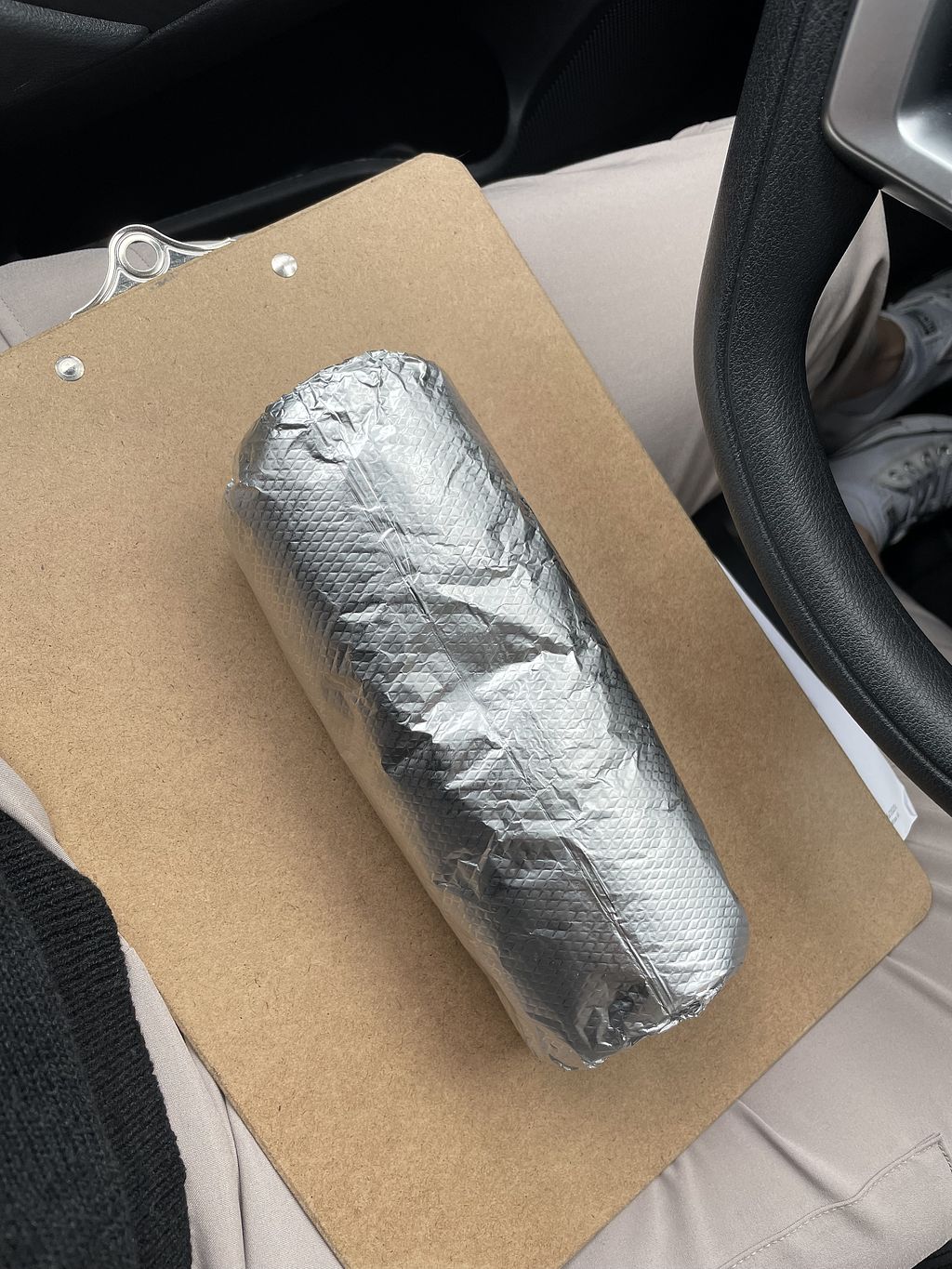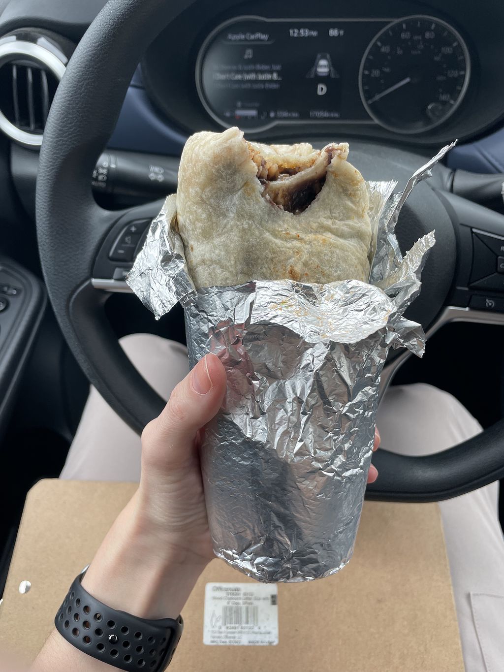 Half eaten Veggie Supreme burrito