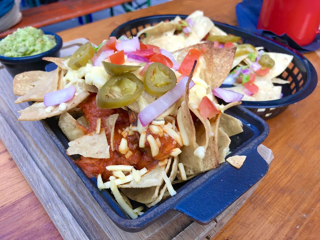 Cool place with plenty of outside seating on bierkeller benches. Vegan tapas menu with mac n cheese, patatas bravas, jackfruit dishes, burritos, burgers and more. The churros are vegan but not the chocolate sauce. Sorbet is the only other dessert option.
