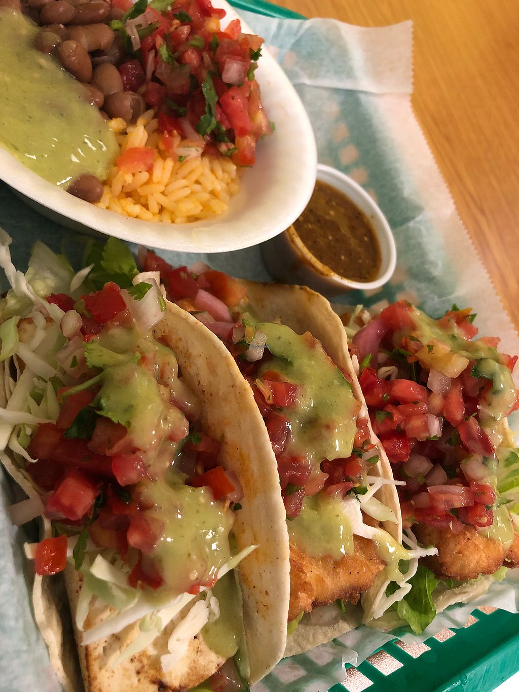 Excellent tofu soft tacos served with guac, rice & beans (vegan) Fast service, great for take out. The owner is super friendly & accommodating. Highly recommended!