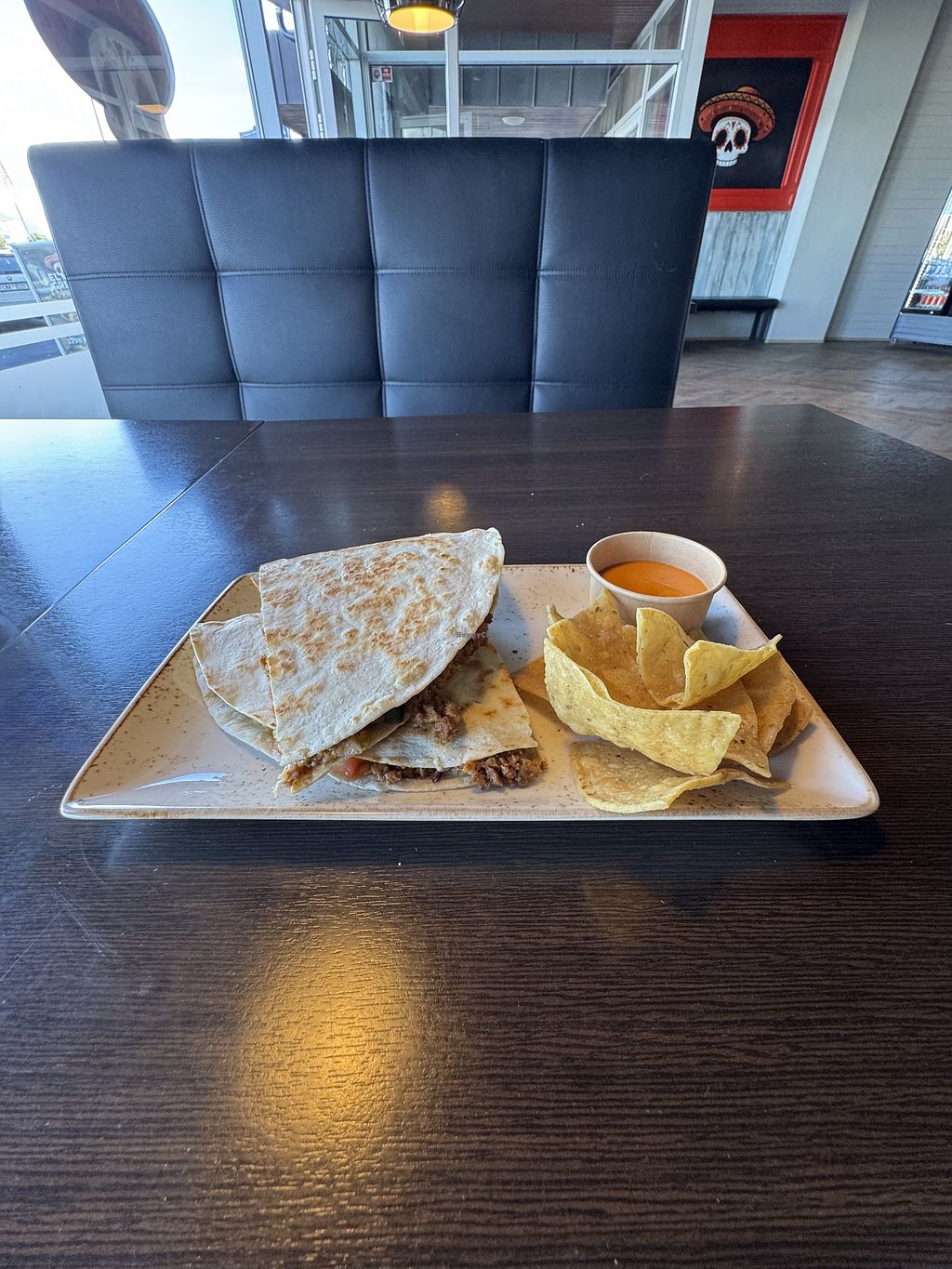 They do vegan chorizo 3 ways - as tacos, quesadillas or burritos. I had the quesadilla and it came with corn chips and a spicy dip on the side. Very fast and friendly service and very satisfying food after 3 long flights to get here.
