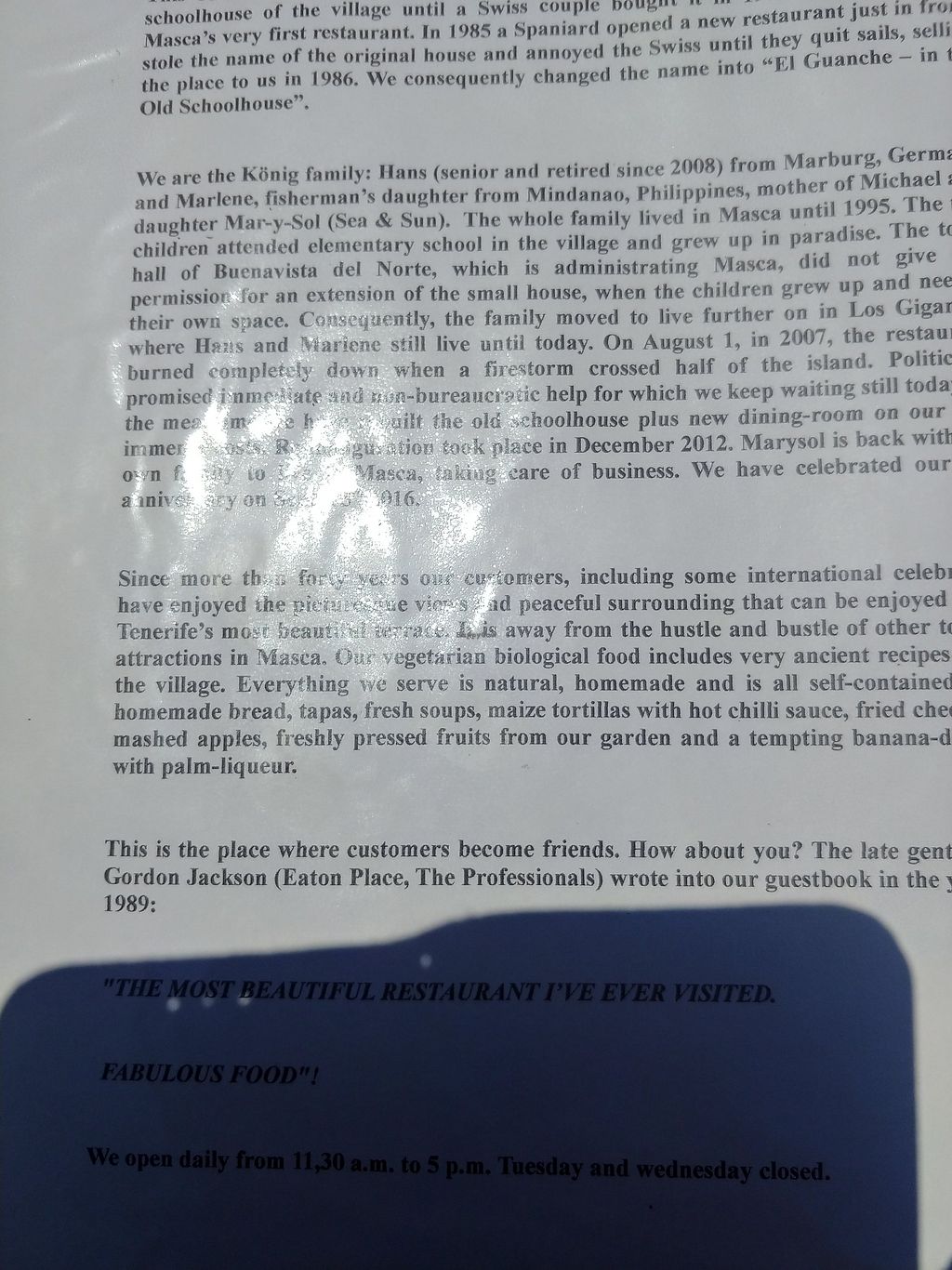 This little restaurant is slightly hard to find, set as it is on the hillside in the small village of Masca. However well worth seeking out. The owner is friendly and, even though we arrived when he was about to close, he enthusiastically fired up his tiny kitchen just for us and made us some delicious Canarian Poatatoes with homemade sauces and fresh vegetables. The view from the terrace overlooking the valley was beautiful and the price was extremely reasonable. Will definitely be visiting again.