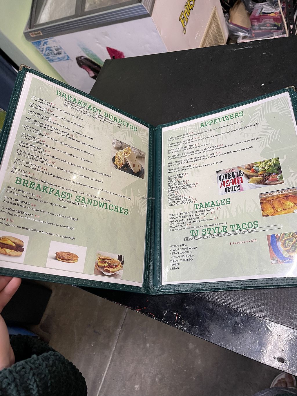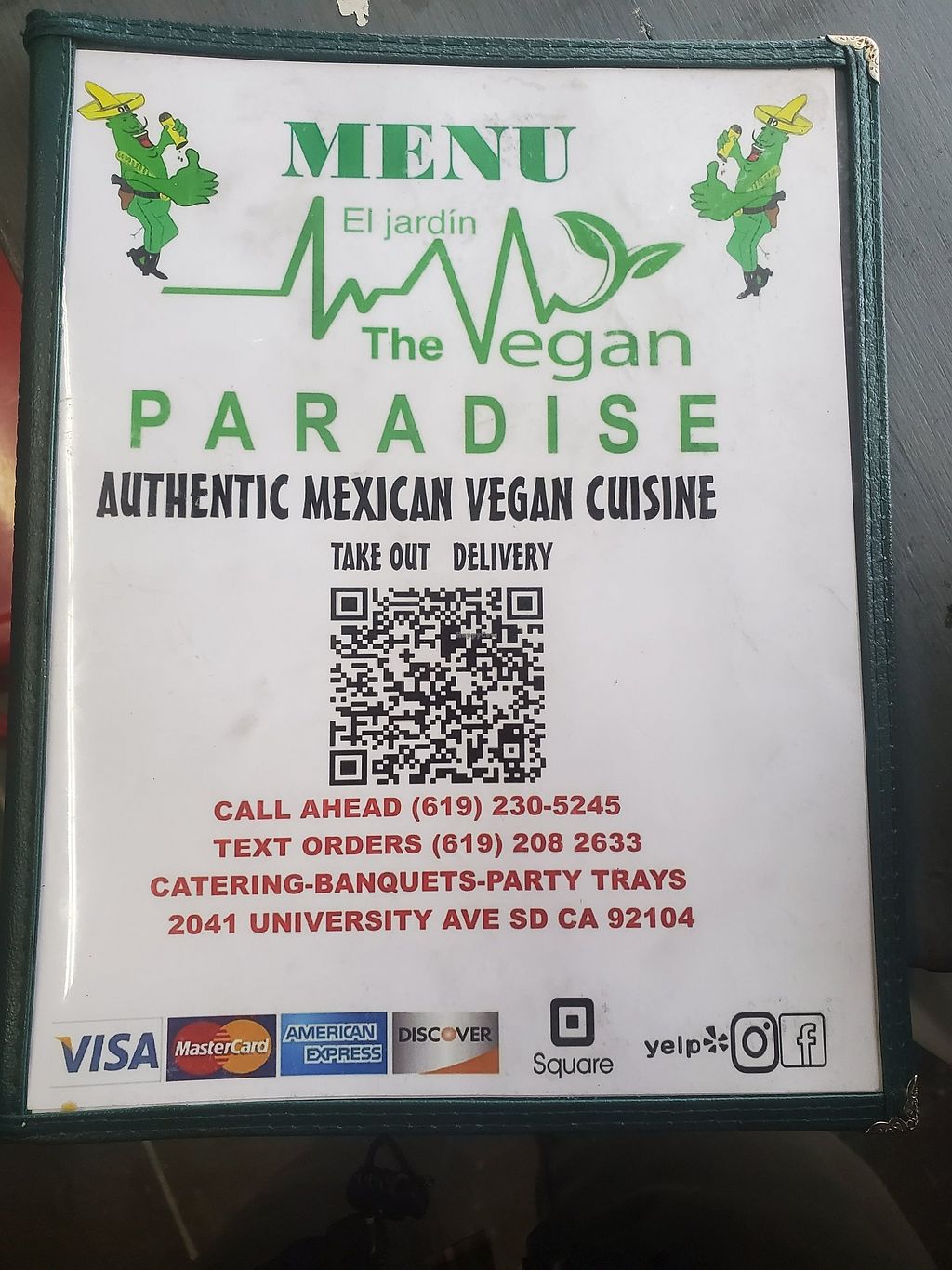 Serves meat, vegan options available. Fruteria, deli, Mexican and vegan food. There is a vegan choice for all the main menu items. (Despite the name establishment is not full vegan, but has a variety of food for vegans.) Relocated from 2041 University Ave. Reported closed April 2025.