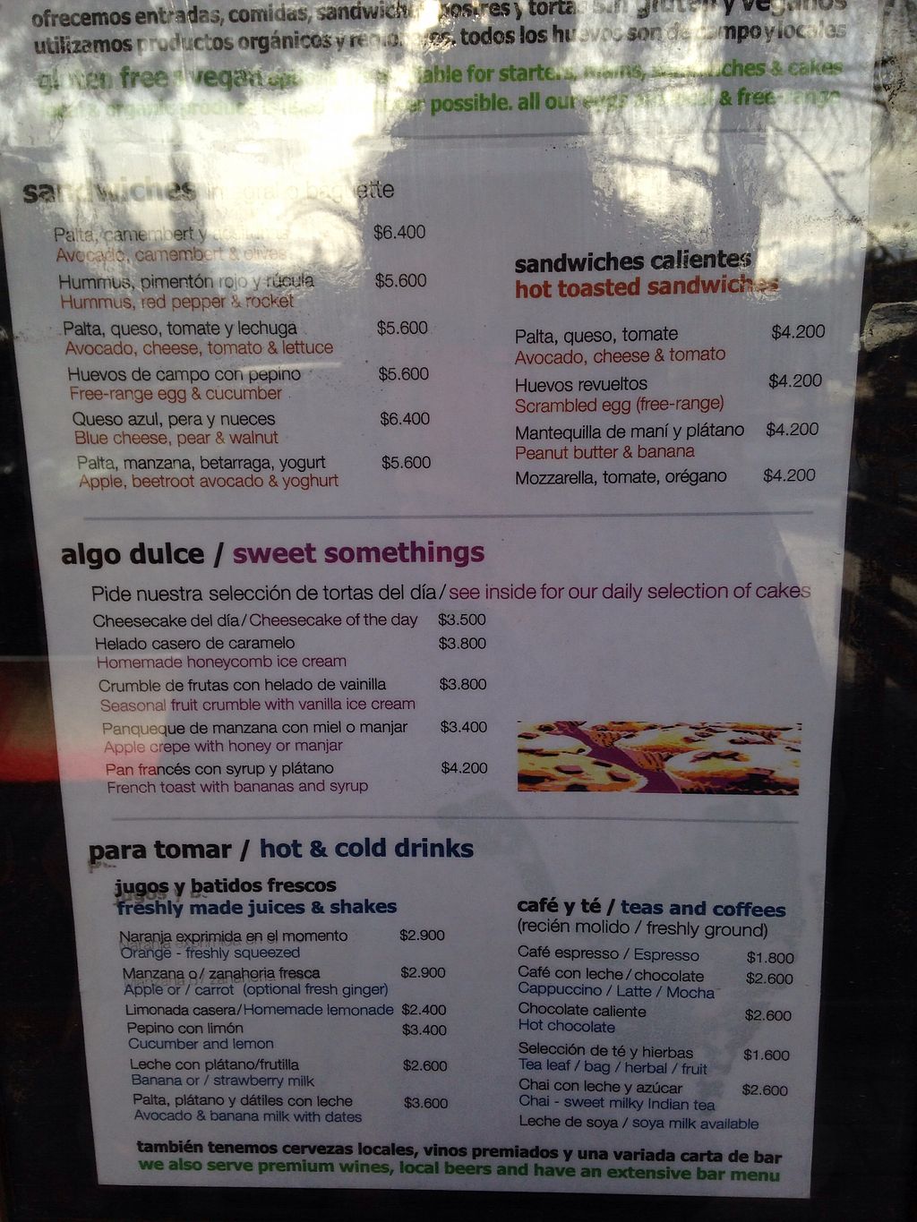 A very friendly vegan-vegetarian cafe and restaurant with the best coffee I had in Chile. Great carrot cake, cool music, tasty burger, good beer - a place that makes you feel at home. But just like many restaurants in Chile no really cheap. Menu is vegetarian-vegan, but they have a vegan-only menu if you ask for it.