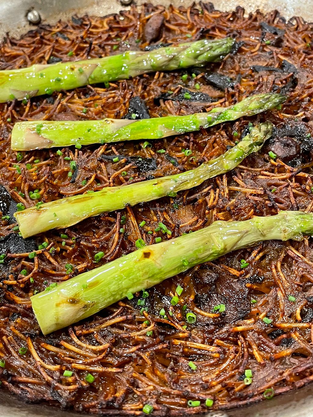 Noodles paella with grilled asparagus and mushrooms