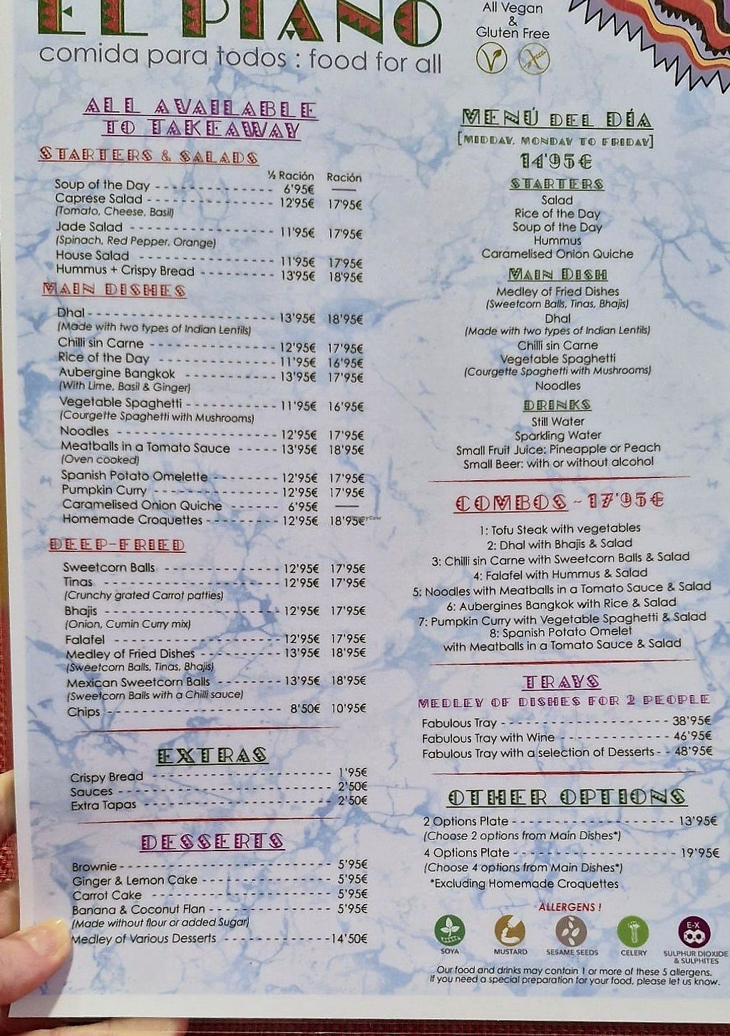 Lots of delicious vegan options. We had the menu del día which proved to have a variety of scrumptious dishes. However the single dish from the menu del día was tasty but massive and might have benefited from the addition of a bit of salad or some bread. The waitress was very helpful too.