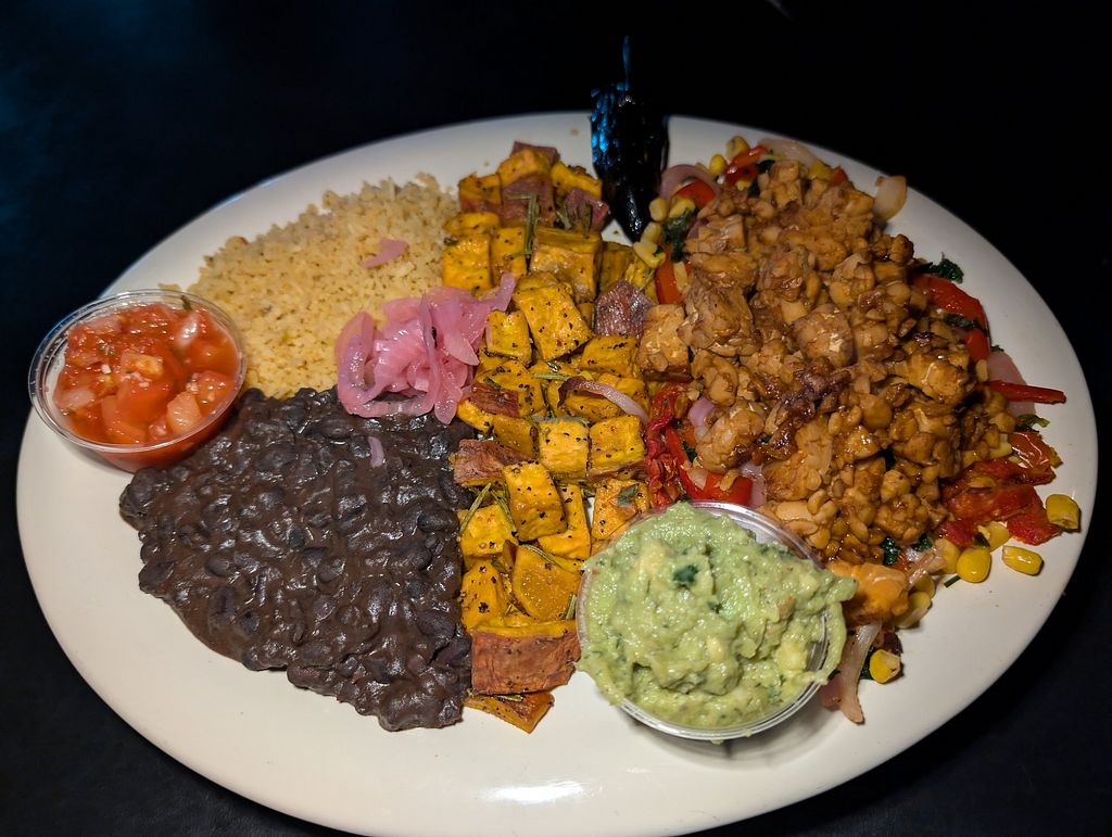 We were in the area and saw the good reviews on happy cow so we decided to check it out. My husband and I and our two toddlers went in on a Wednesday at 7:00pm. It definitely feels like a bar when you walk in. It’s very dark inside and the bar takes up half the room. I was surprised about this because the description doesn’t say anything about that. I was worried they might tell me no kids allowed. They didn’t say that but they did say they didn’t have a highchair. I said ok we’ll just hold the youngest then, no big deal. We ordered the guacamole and chips for appetizer which was amazing. Probably one of the best guacamoles I’ve had in a long time. It had a different taste to it almost like very strong olive oil, but it was delicious. We each ordered the vegan tempeh platter with tortillas. It came with spicy tempeh and sweet potatoes, a side of black beans, rice, peppers/corn mixture, and a smoked chili pepper. Everything was absolutely delicious. It was a tad spicy but really good and I like spicy food so I loved it. I wish we lived, closer I’d eat here all the time!
