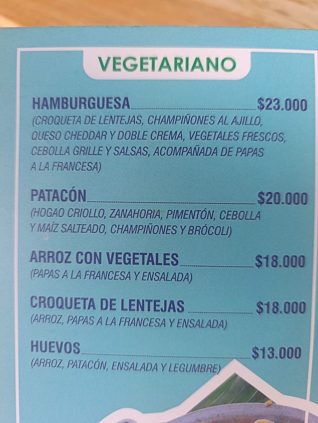 Serves meat, vegan options available. Restaurant offering items that can be made vegan such as burger, patacón, rice with vegetables and lentil croquettes. Open Mon 7:30am-5:30pm, Wed-Sun 7:30am-5:30pm. Closed Tue.