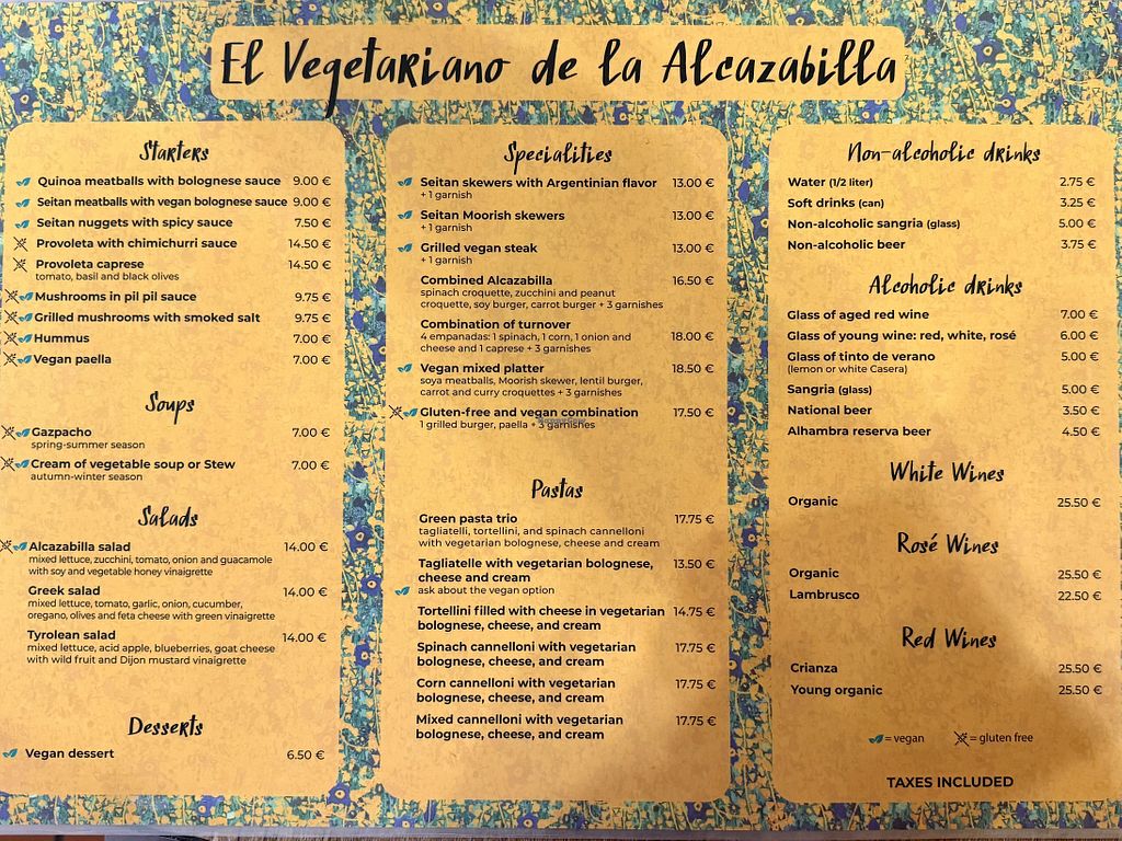 Restaurant has plenty of vegan options & some gluten free options. I had the mixto vegano & it was nice and filling. Paid €17