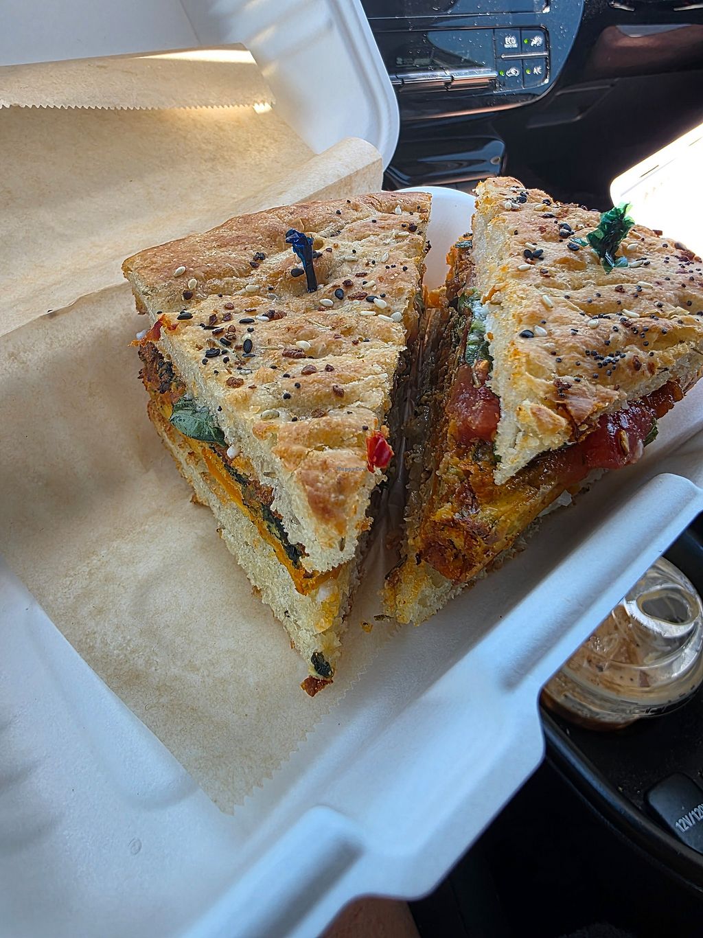 Jalapeño sweet potato biscuit and a cinnamon roll, the glaze is on the…