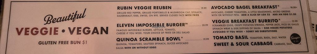 The menu isn’t totally clear on what’s vegan and vegetarian, but there were quite a few options, especially with modifications. It was definitely very pricey for the amount of food (ex. $20 for an impossible burger on two pieces of toast).