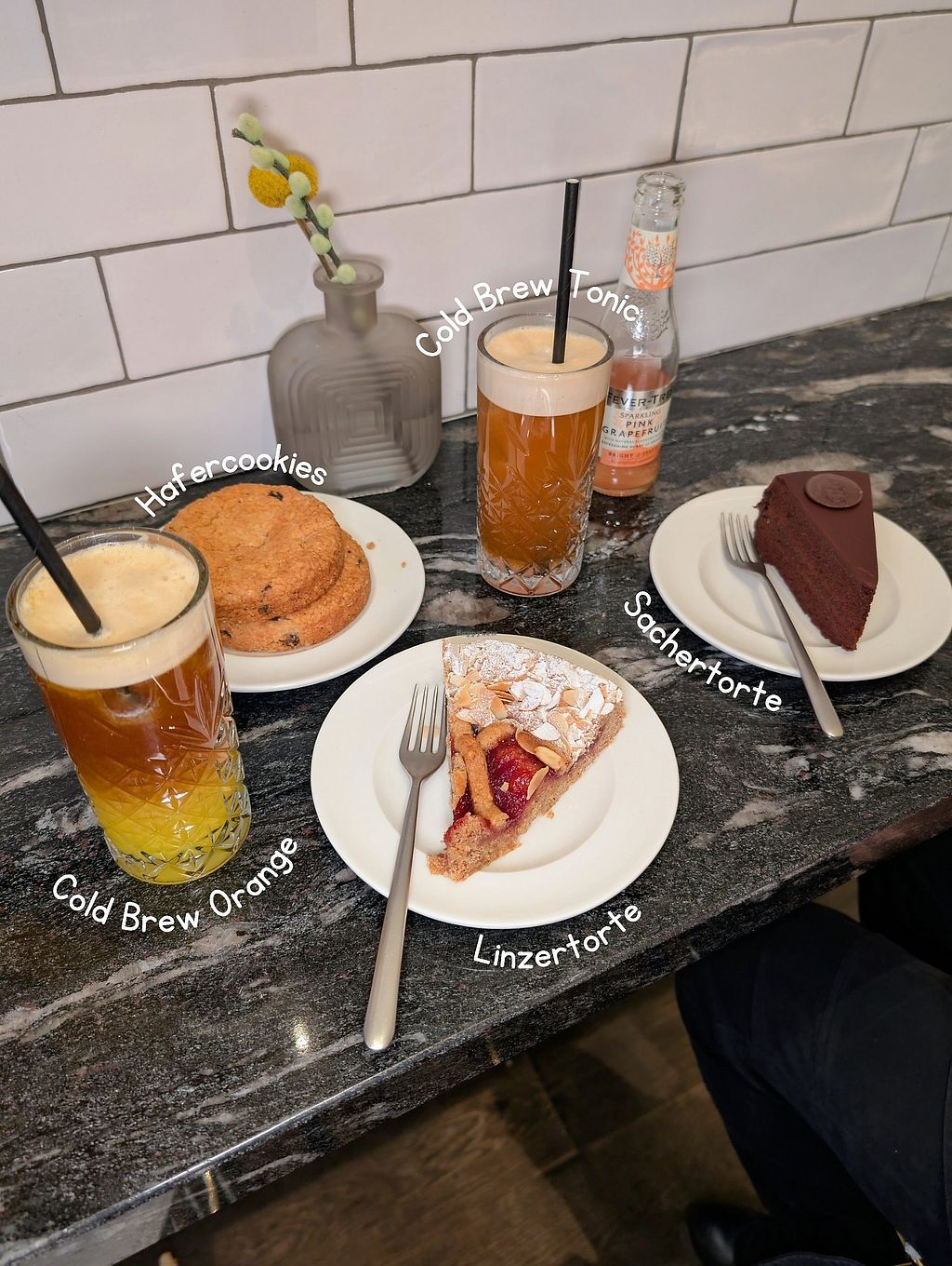 Wo bekommt man sonst vegane Sachertorte? 🙌🏼😄 Sehr saftig und nicht zu viel Marmelade, aber noch besser war aber die Linzertorte 😍. Auch die Kaffee-Kombinationen sind spannend: Cold Brew mit Orangensaft und Cold Brew mit Tonic ☕.