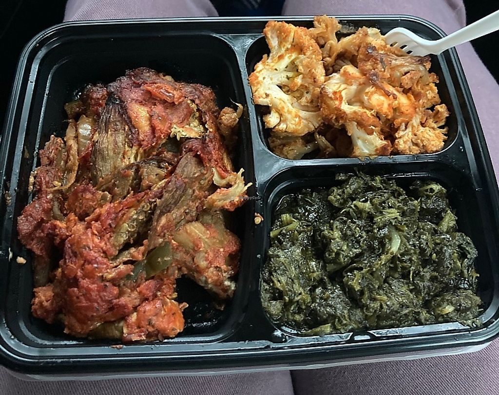 Takeout of eggplant parm entree with roasted cauliflower and spinach a…