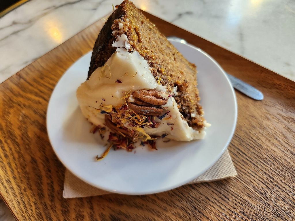Read moreAs for the coffee, I took a moka. It was quite expensive, and I don't like the fact that you have to pay extra for plant based milks, but that's very frequent unfortunately... I made sure I said "with almond milk" clear enough, and the waiter did respond "almond milk", but the coffee arrived with a lot of whipped cream on top, so I had to return it, and there was indeed a mistake. They apologised and made me a new one, without making me pay extra, so that's nice. But I'm glad the cake options were clearly labeled cos I'm not sure they would be much aware about the ingredients otherwise.
