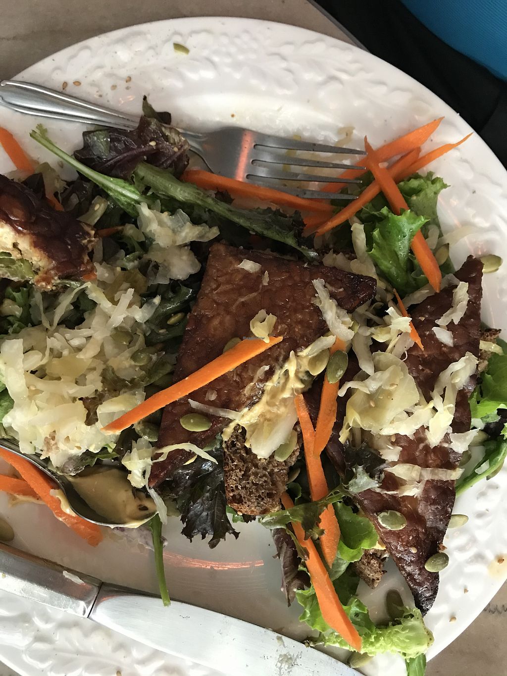I ordered the tempeh Rueben and my husband had the brown rice and beans bowl. My Reuben was delicious and flavorful but not sloppy like some vegan Reubens tend to be when vegan mayo gets overused. The crisply grilled tempeh was complemented with tangy brown mustard and golden sauerkraut. I had plentiful fresh greens. My husband's rice bowl was simple and delicious- brown rice, black beans, greens, and a hearty slice of butternut squash, all sprinkled with pumpkin seeds. The portions were generous, but we finished everything!