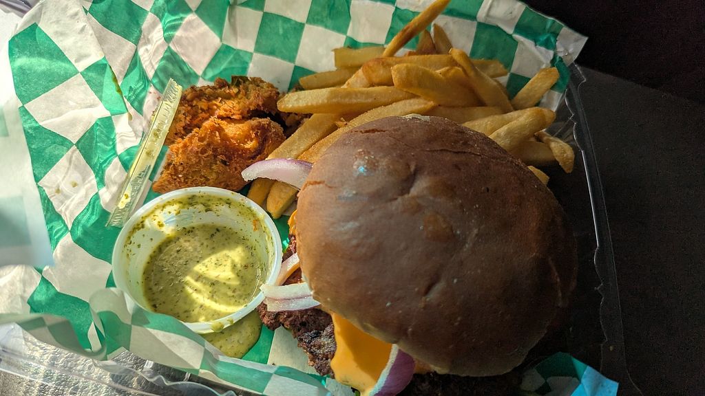 Fish sandwich, chik’n nuggets, mac n cheese. Spicy Chikn sandwich