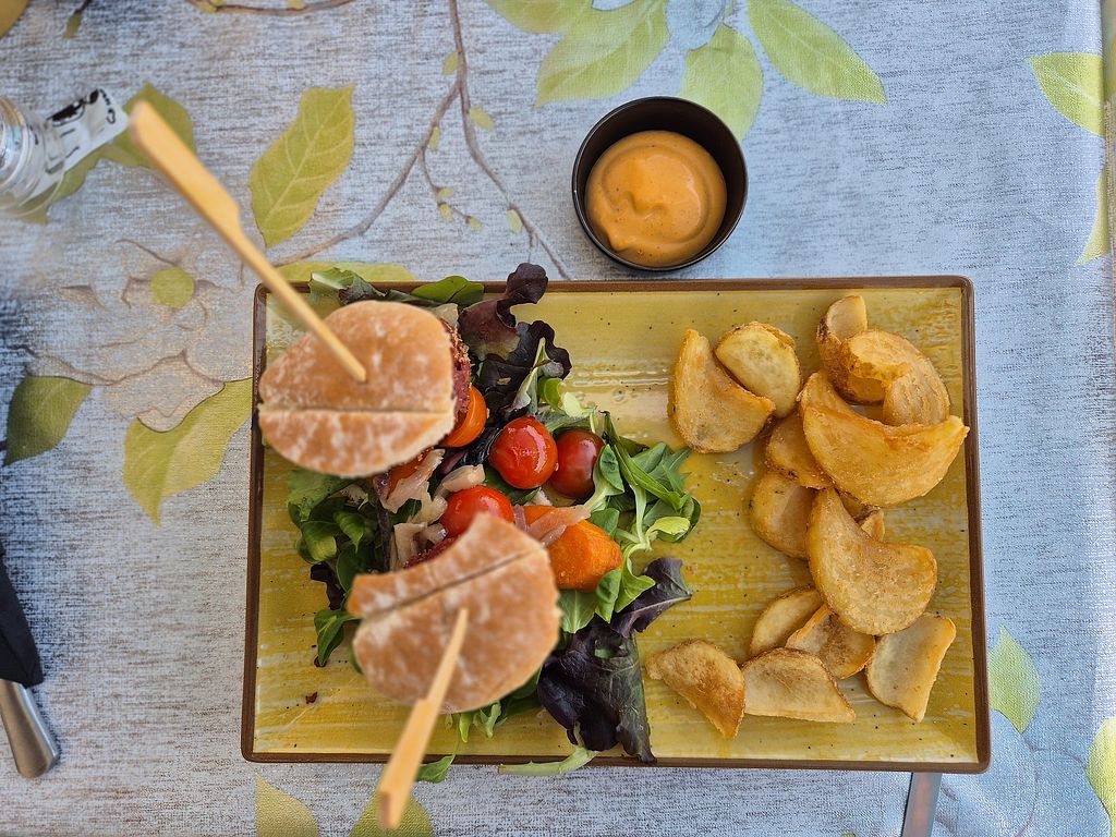 Ik heb een zelfgemaakte broodje burger gehad met aardappel partjes en het was echt lekker.