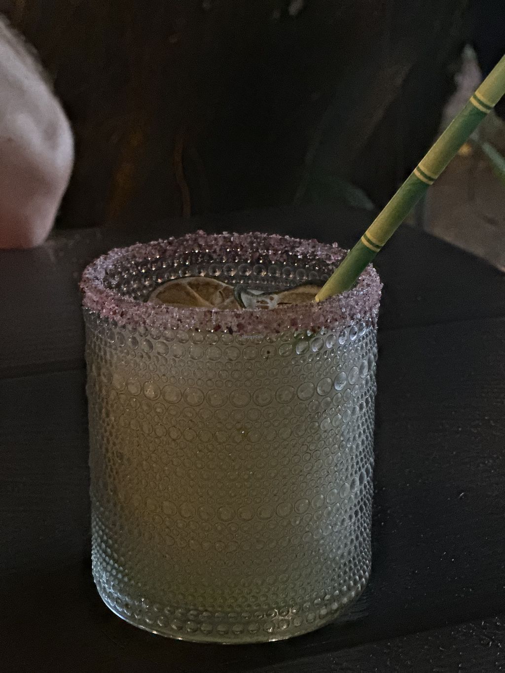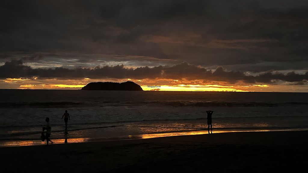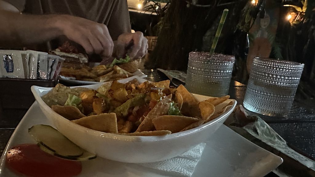 Vegan burger (plantain as buns, chickpea patty, onion, tomato, cucumbe…