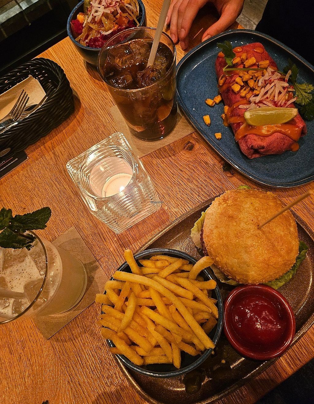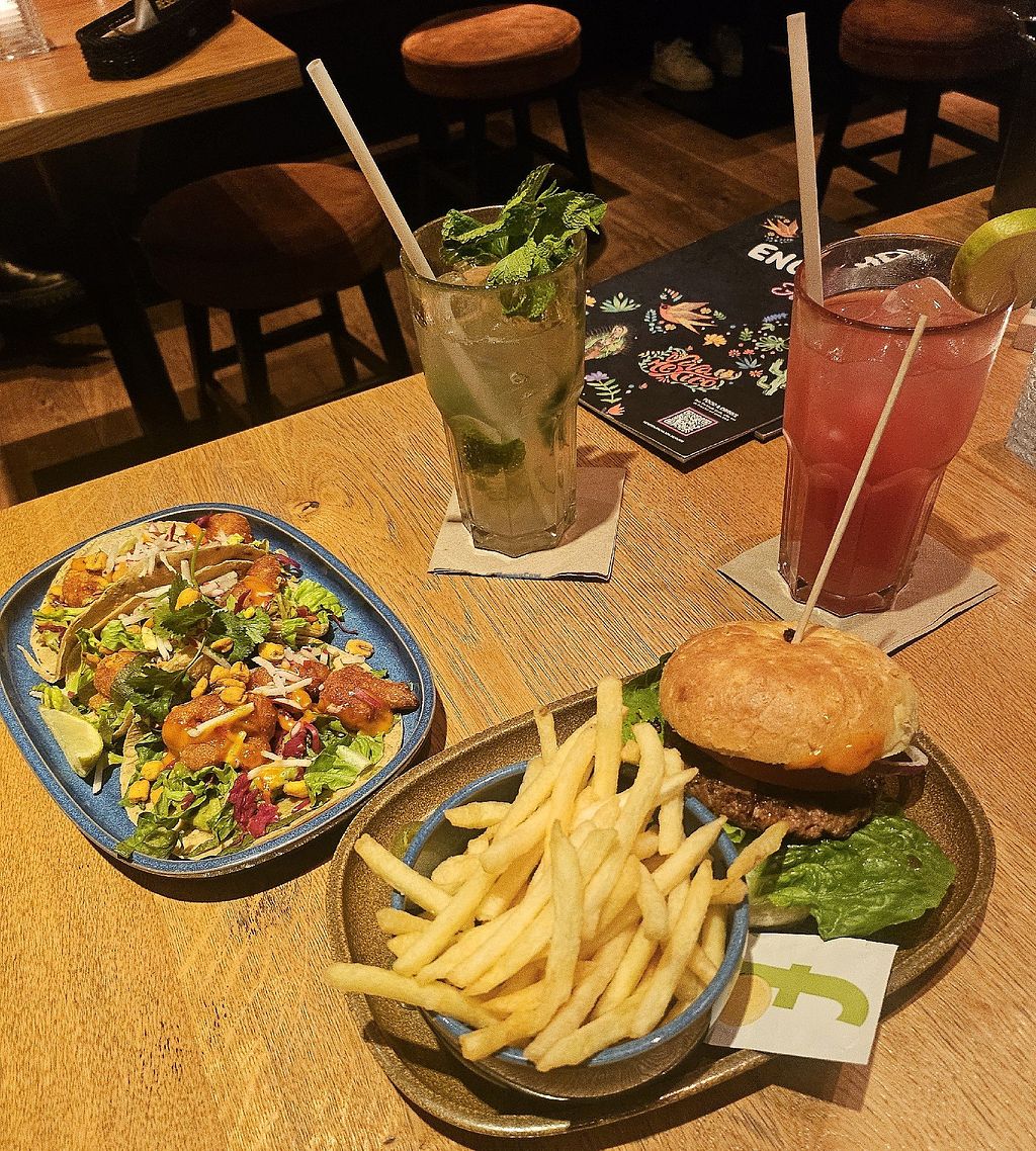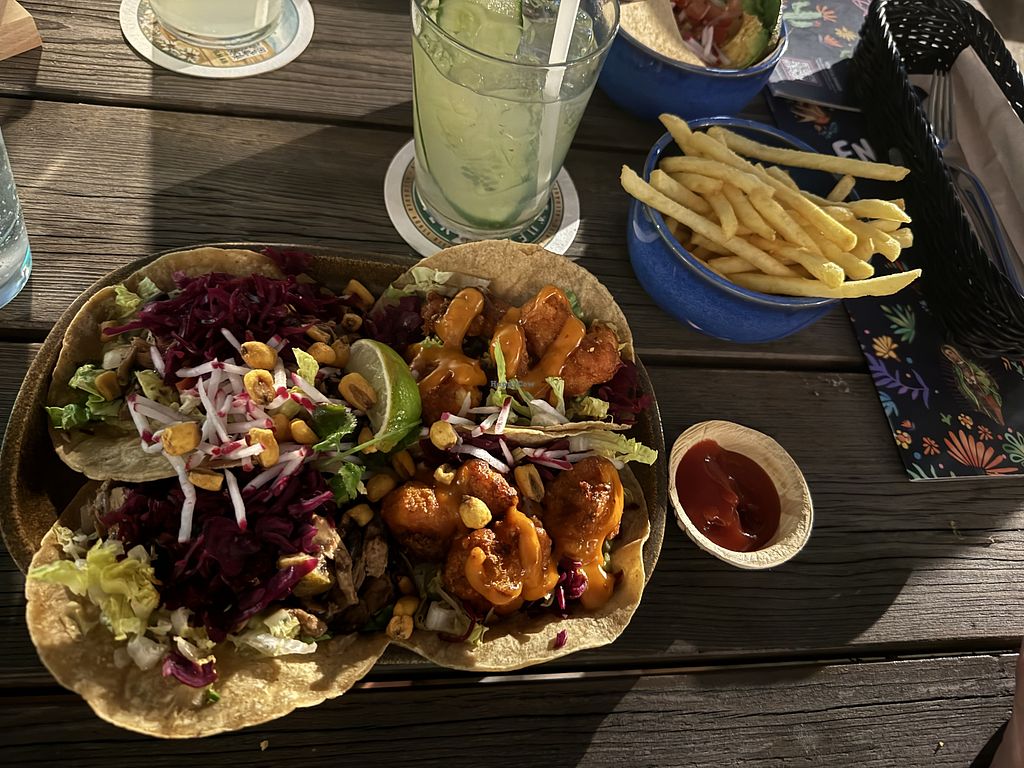 fajitas with vegan chicken, sidesalat, fries