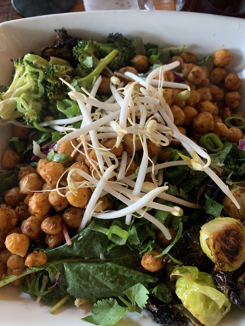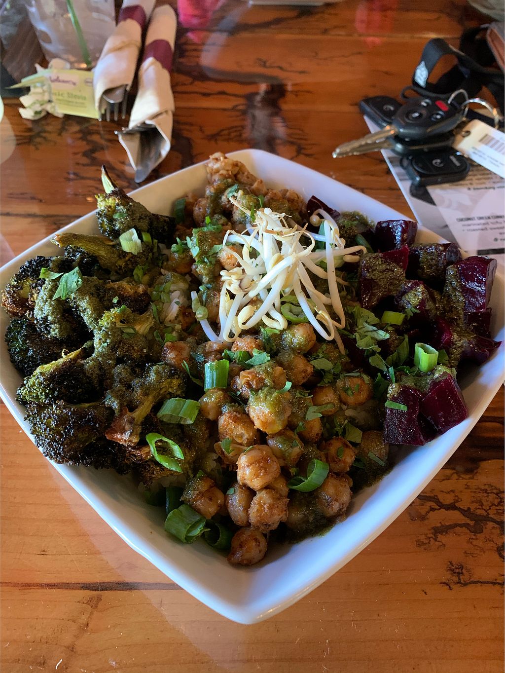 The atmosphere was relaxed. The hibiscus tea was fresh and delicious. We had the make your own bowl with chick peas/ broccoli/tofu on a bed of different lettuces. It was delicious. We loved everything.