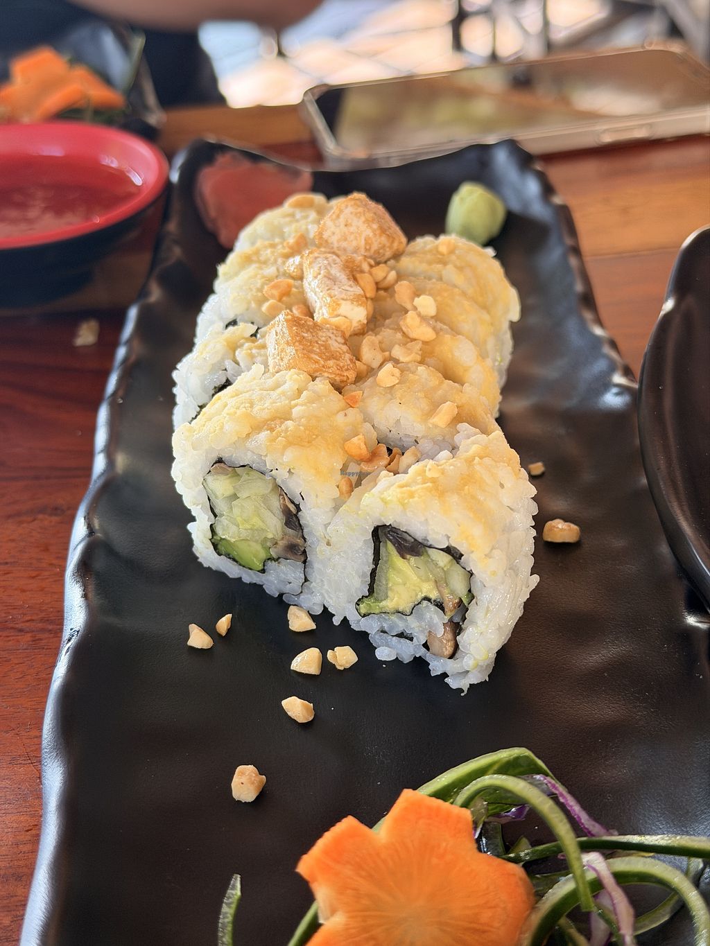 Food was good! Portions are small for the prices. I tried 2 of the vegan rolls, the one with mango is super tasty. I switched out the fried tofu in the mushroom roll for fried sweet potato and it was good.