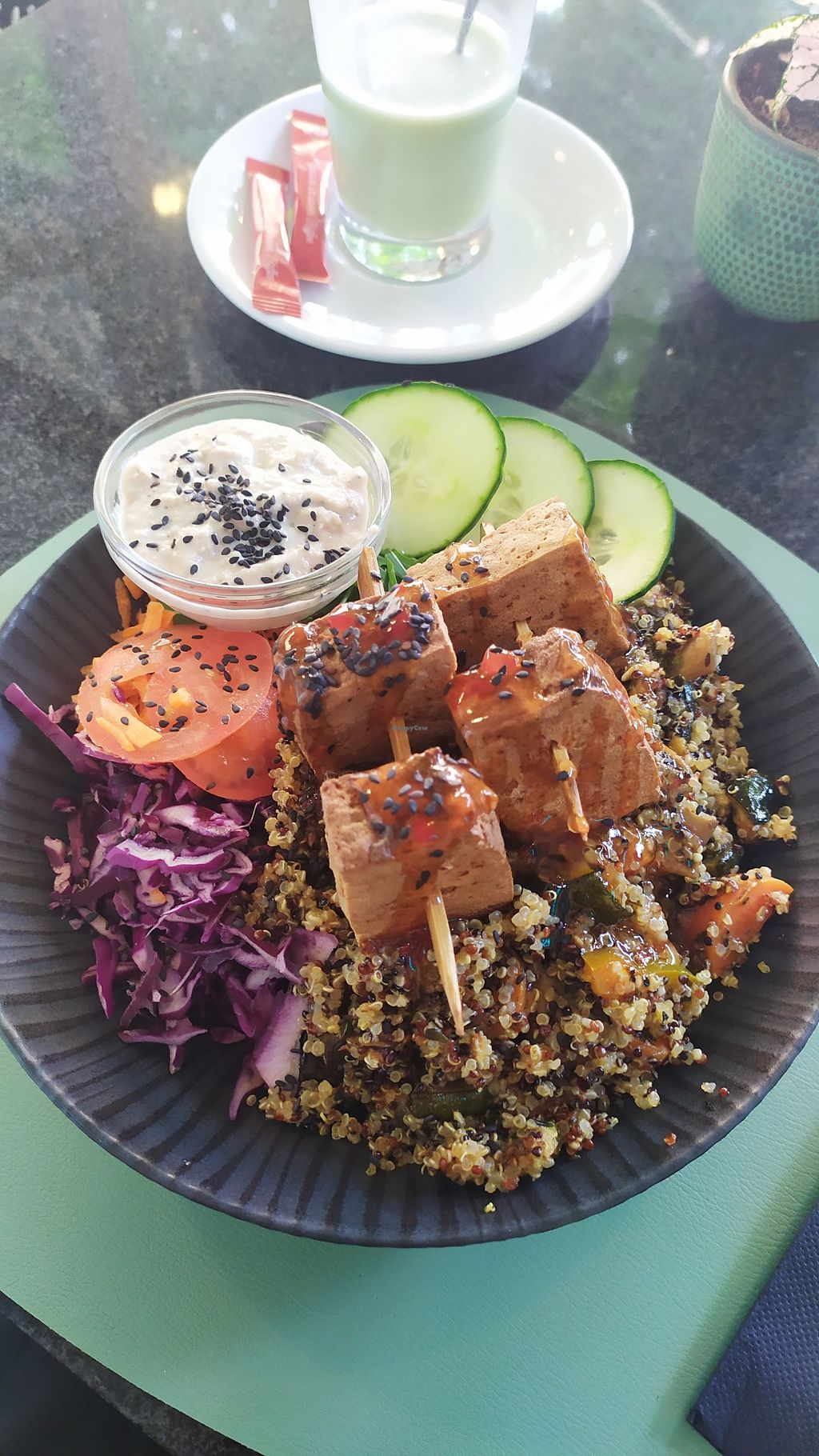 Falafel bowl with quinoa and a dill yogurt dip