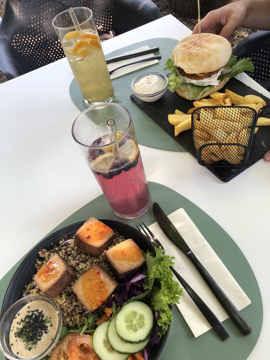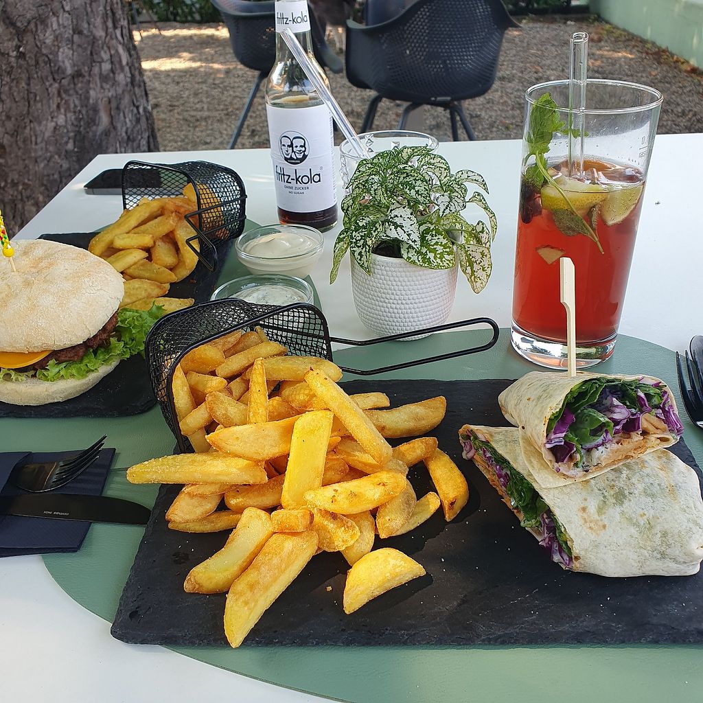 gyros wrap & beyond meat burger with home fries