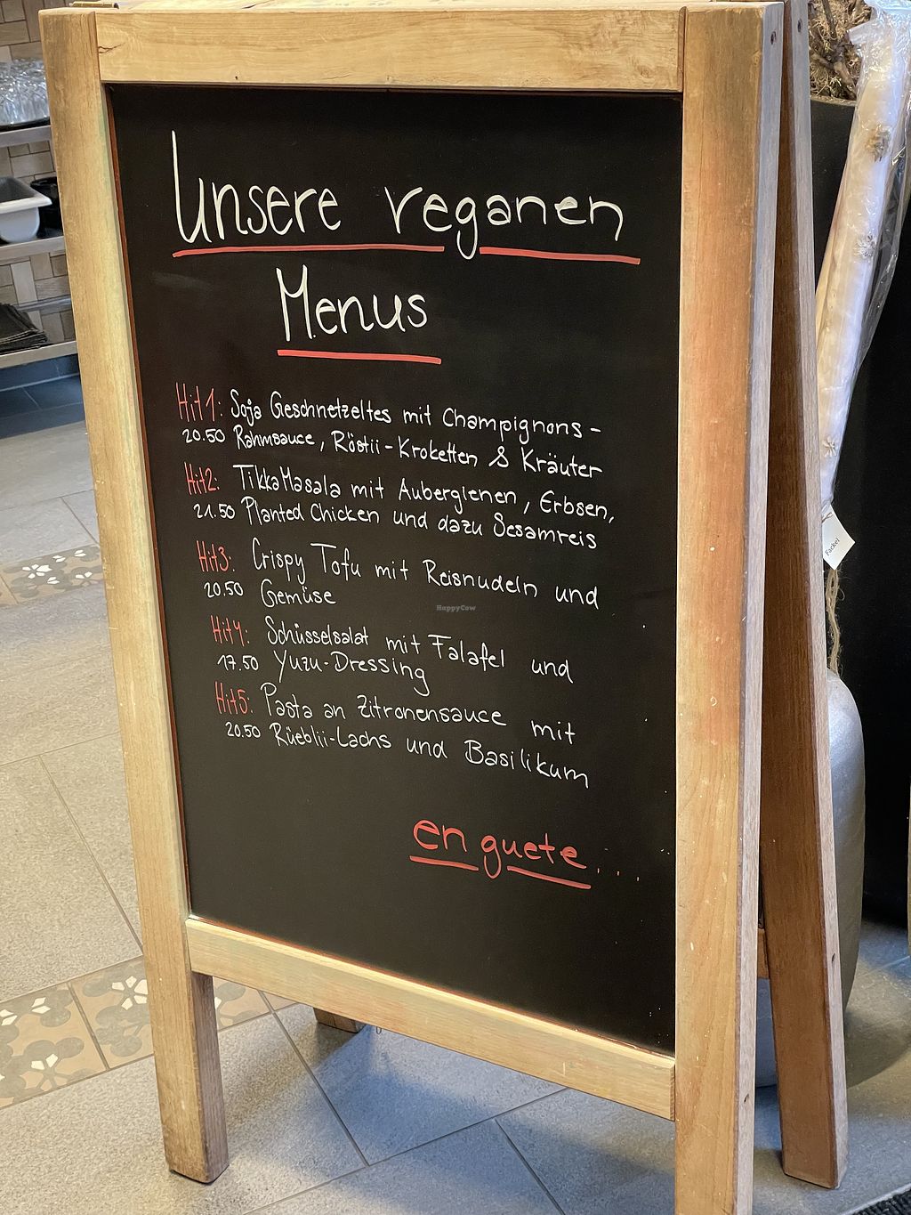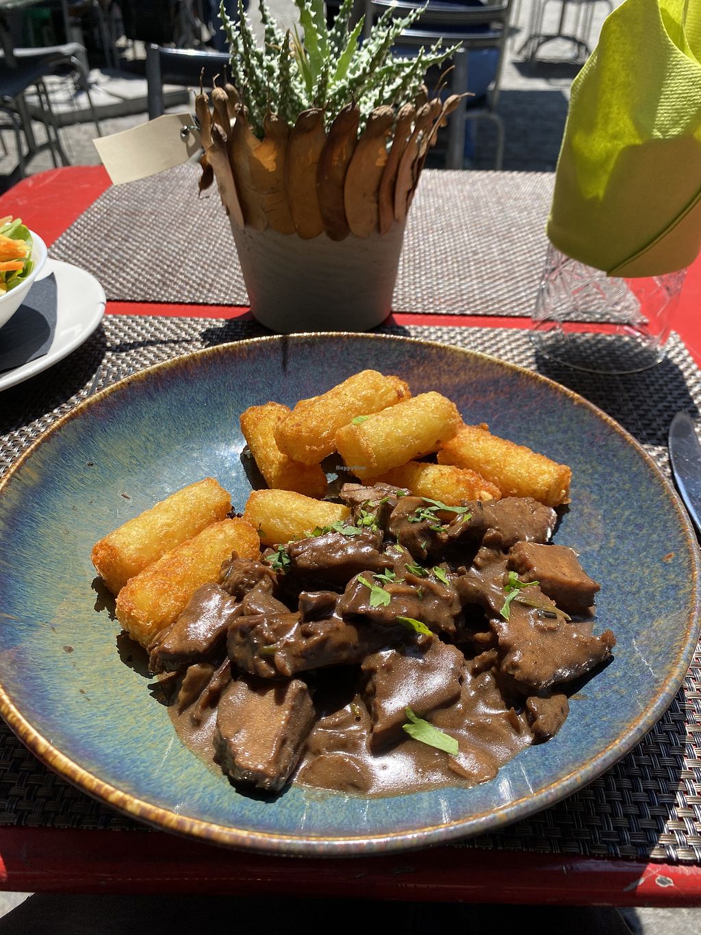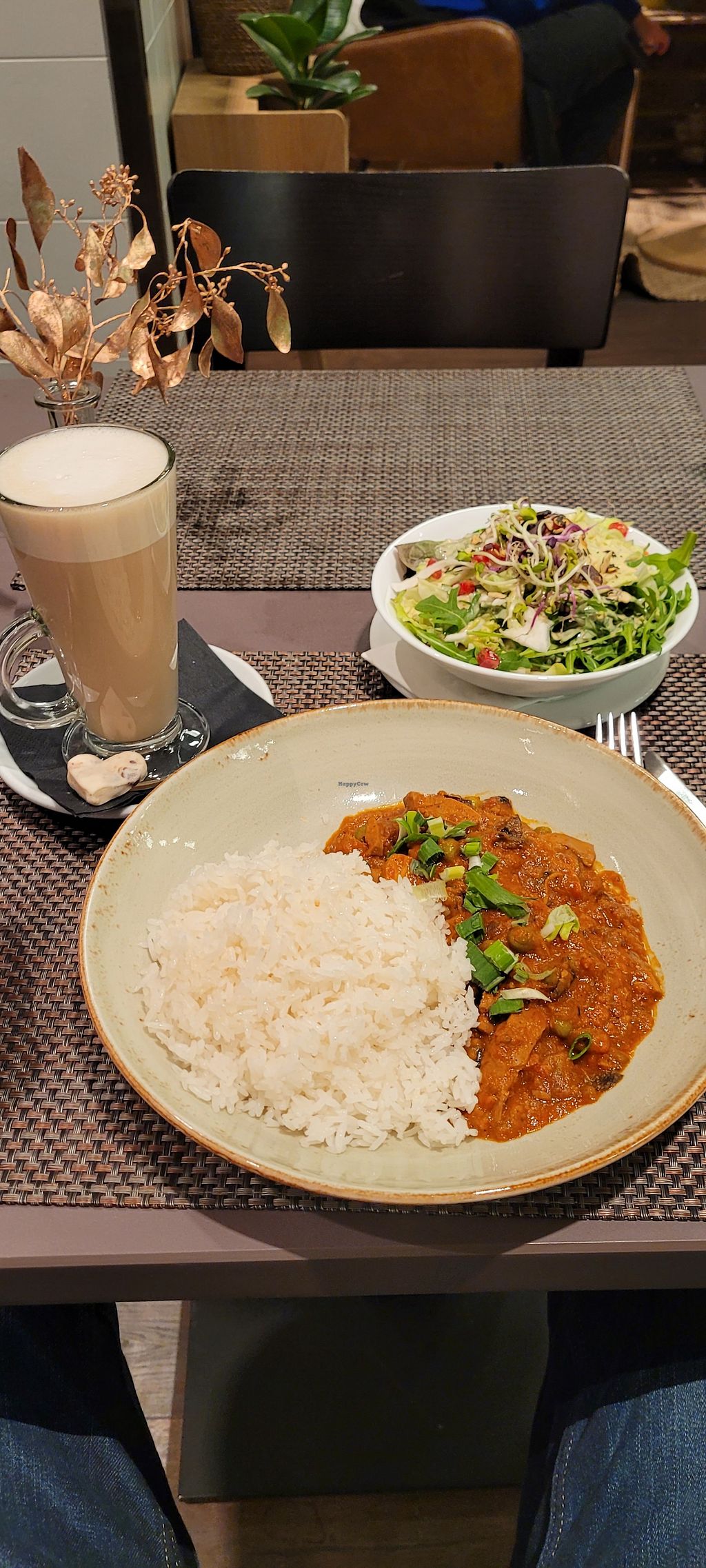 Bunter Salat, planted Chicken Curry mit Reis. Chai latte mit Reismilch…
