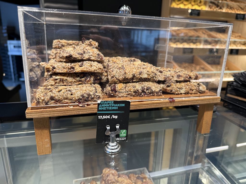 Greek bakery and cafe offering clearly marked vegan baked goods including cookies and pastries, as well as plant-based milk alternatives for drinks. Open Mon-Sun 6:00am-10:30pm.