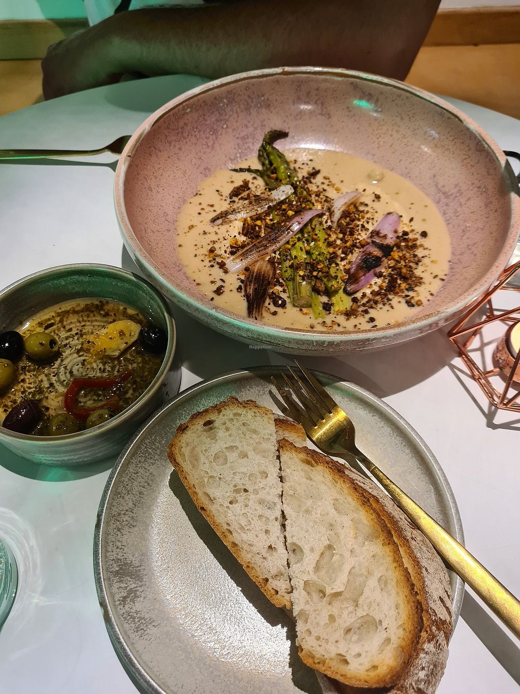 Warmed olives and hummus