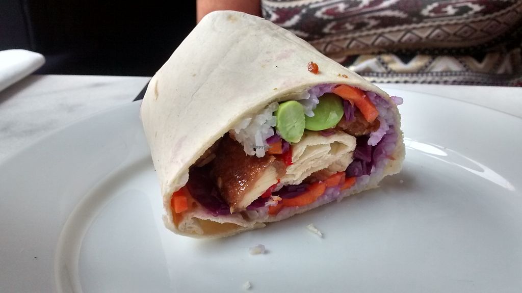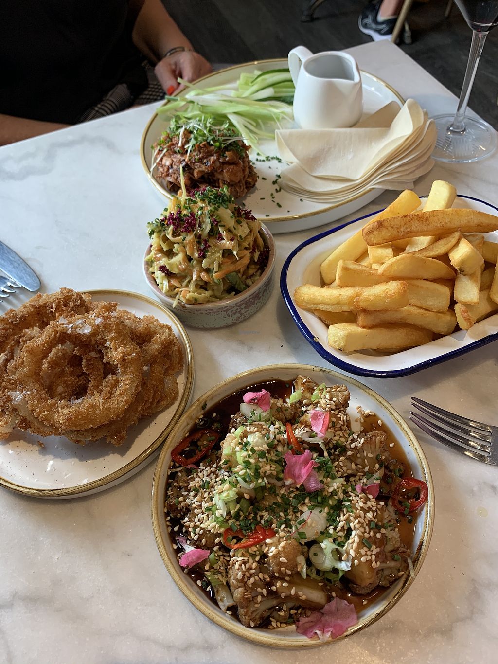 Sharing “duck” pancakes, slaw, chips, onion rings and cauliflower wing…