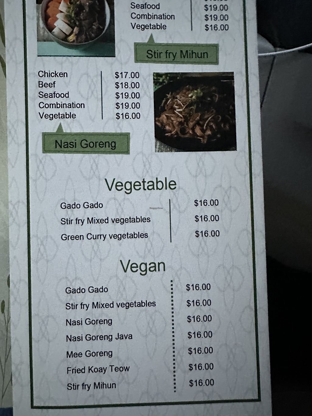 Serves meat, vegan options available. Restaurant with a separate vegan menu with items like Gado Gado (Indonesian vegetable salad with satay sauce), Nasi Goreng (Indonesian fried rice with vegetables), Nasi Goreng Java (fried rice with noodles and vegetables), Mee Goreng (stir-fried Hokkien noodles), and more. Open Tue-Fri 11:30am-3:00pm, Tue-Thu 5:00pm-9:00pm, Fri 5:00pm-9:30pm, Sat 11:30am-9:30pm, Sun 11:30am-9:00pm. Closed Mon.