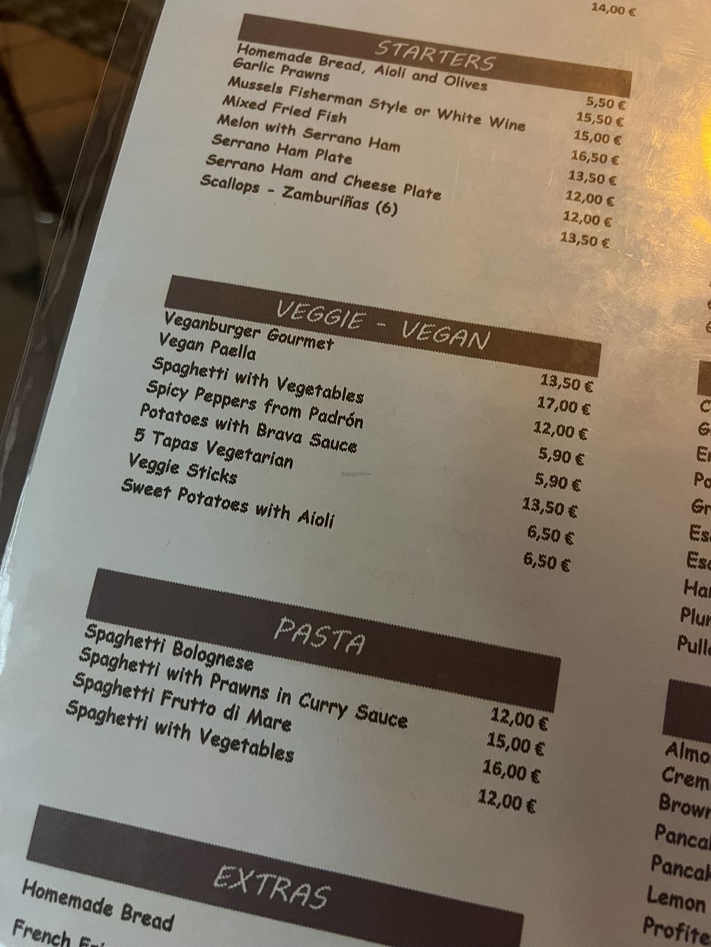 The vegan paella is really nice and the portion is pretty big. For vegetarians there is the choice of 5 tapas which are nice. But otherwise not many options.