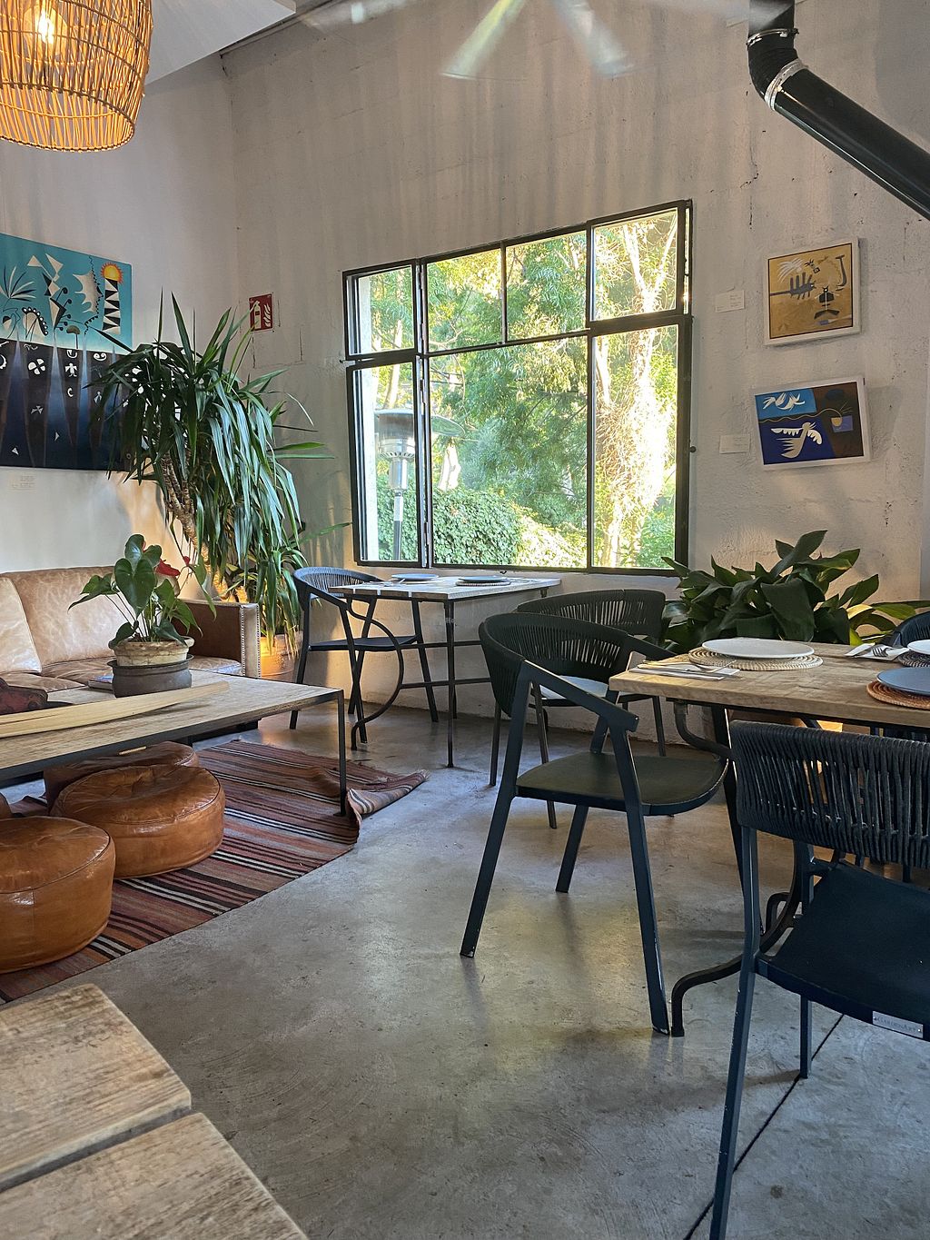 The vibe was great, with a modern, industrial chic interior and large windows with views of a garden and a tree-lined street, letting in abundant natural light.