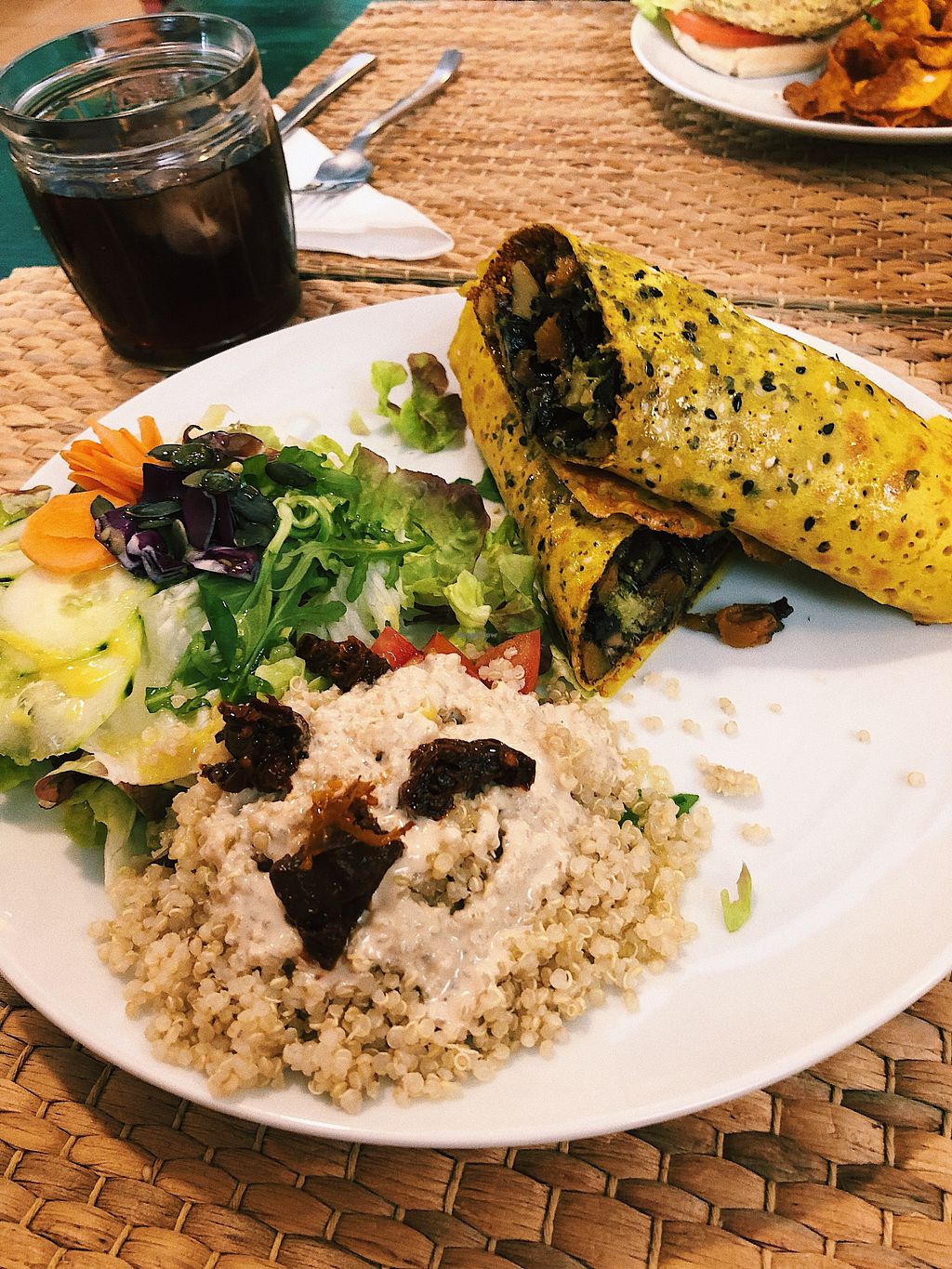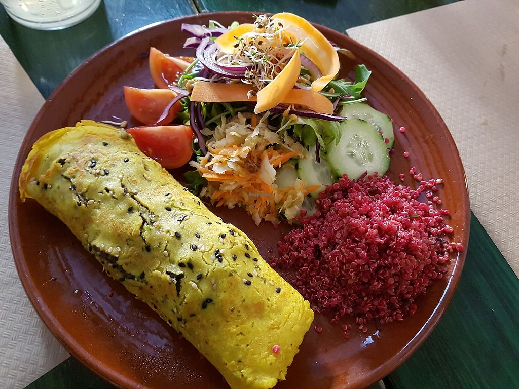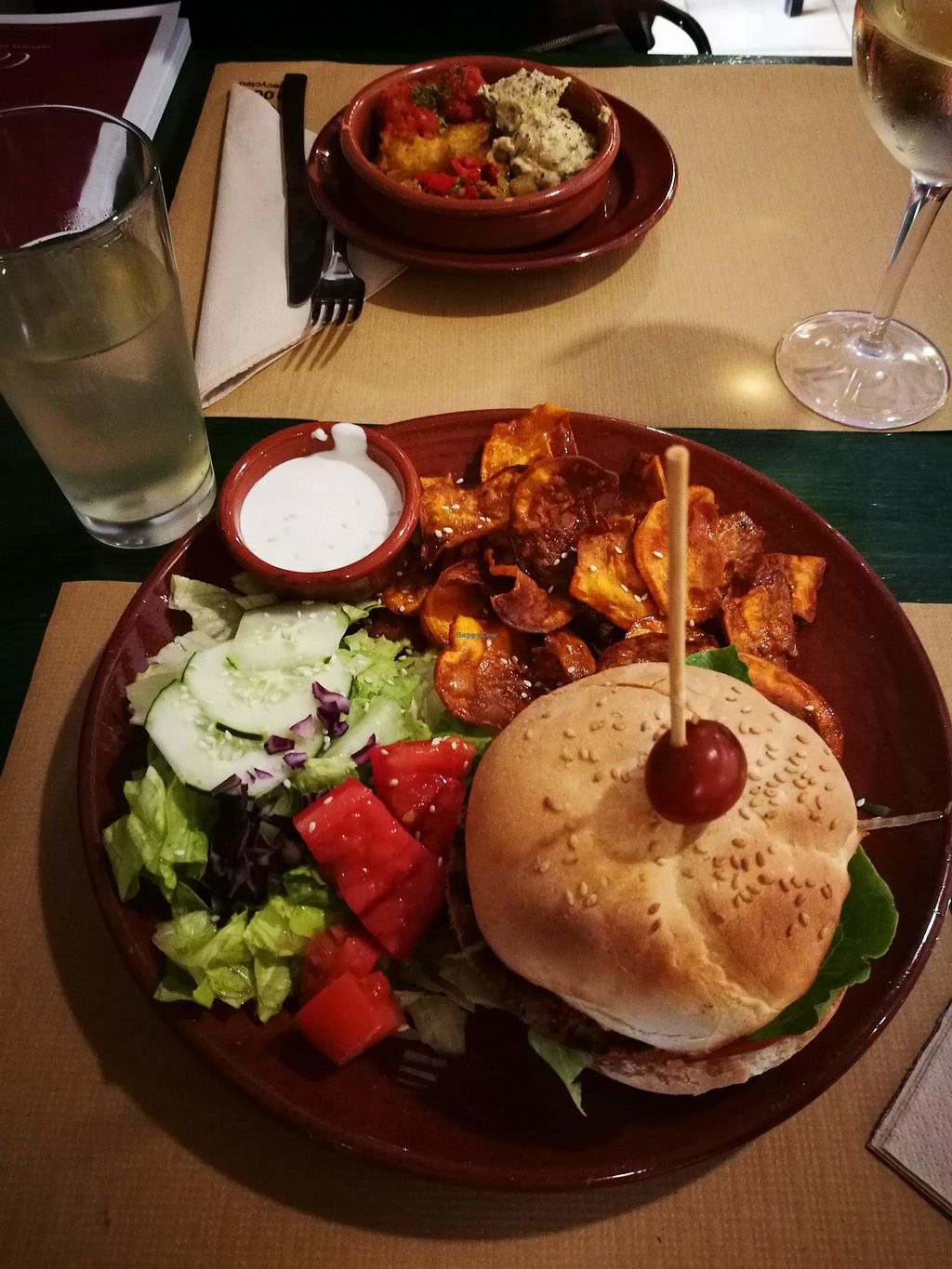 Das ist das gegrillte Seitan Steak mit Süßkartoffeln und Salat. Die Ve…