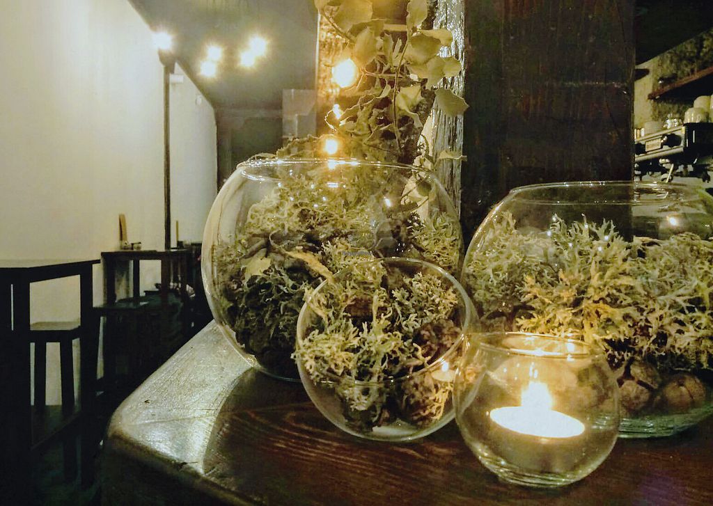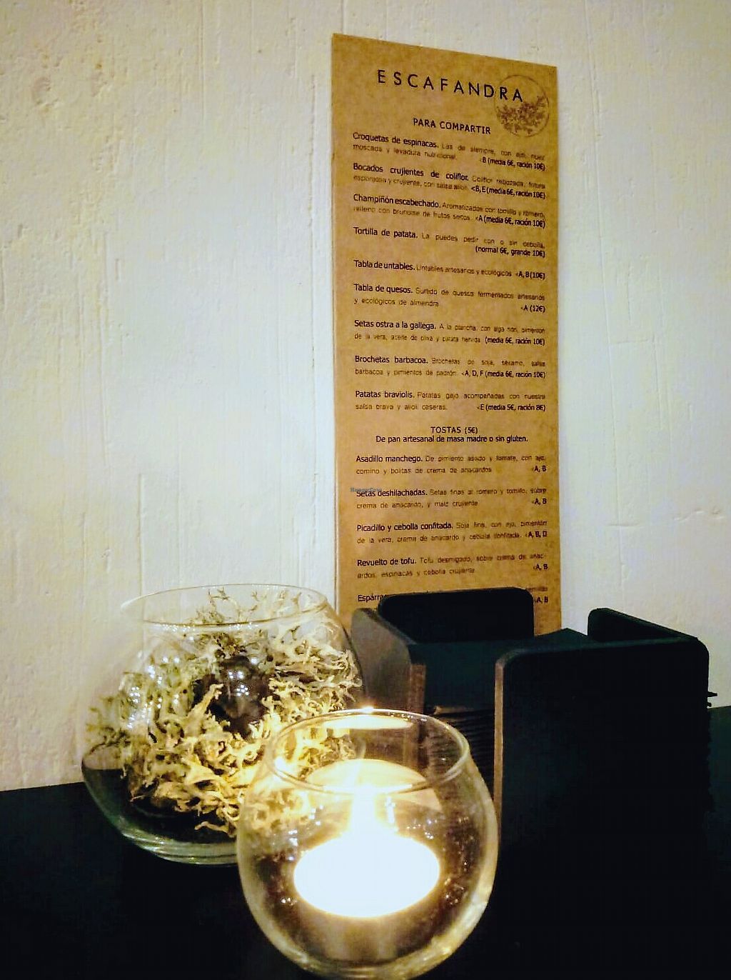 Traditional cuisine modernized and adapted to a cuisine based on vegetables and vegan products which are mostly local, artisan, ecological. Example of choices include croquettes, patatas, donuts, skewers, migas del pastor, variety of toasts, salads, and dessert like flan de coco. Drinks are smoothies, kombucha, coffee, organic soda, lemonade, alcohol. Has a small retail area. Est. 2018. Reported closed November 2020.