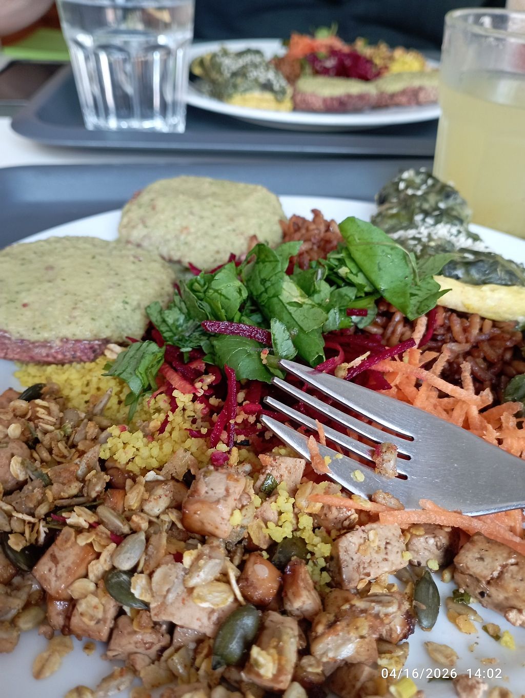 Bulgur burger and tofu mix mango mix juice and lemon cake