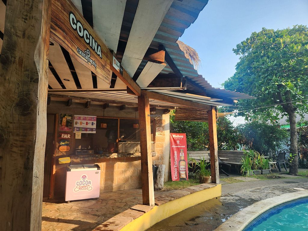 Serves meat, vegan options available. Laid-back hostel with restaurant offering vegan choices on request such as vegetable pasta, banana pancakes, avocado toast, tomato soup, salads and desserts. Open Mon-Sun 7:00am-8:30pm.