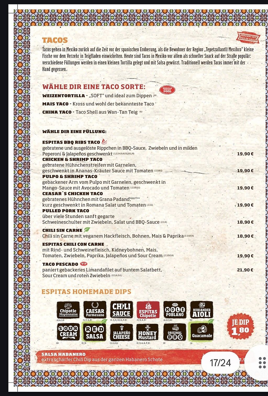 Unser Aufenthalt im Espitas war sehr angenehm. Wir hatten vorher reserviert und das würde ich auch so empfehlen, da das Restaurant zwar von außen sehr groß aussieht, jedoch gar nicht so viele Sitzplätze anbietet. Die Kellner sind sehr aufmerksam und beraten einen auch gerne. Zudem ist es auch sehr praktisch, dass man Getränke per QR-Code bestellen kann. Die Preise sind zwar sehr hoch, das liegt aber daran, dass die Portionen auch sehr groß sind. Daher würde ich empfehlen eher auf eine Vorspeise zu verzichten, weil sonst der Hauptgang nicht mehr ganz reinpassen könnte :). Alles in allem aber eine Empfehlung und wir würden wieder hinkommen.